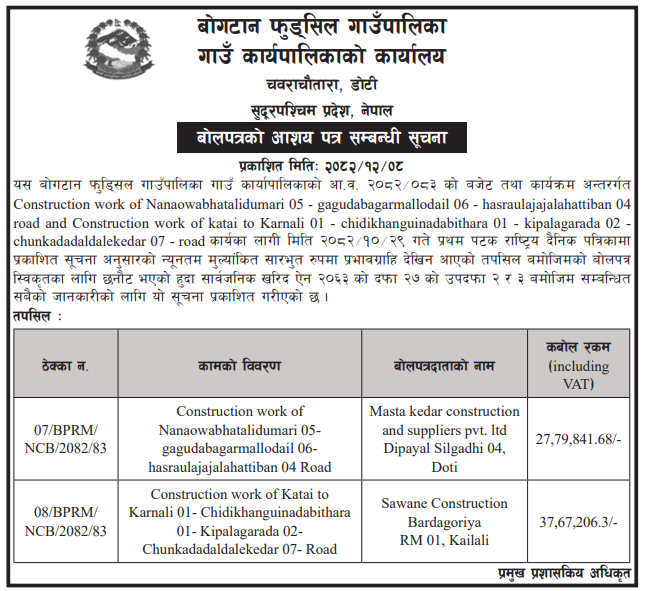 | 36 | Bheemdatt Municipality | Various Road Gravelling Works, Ward no. 05 | 20/03/2026 | PPMO | 05/04/2026 | Click Here | |