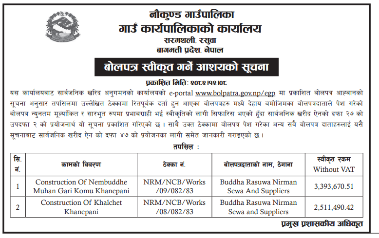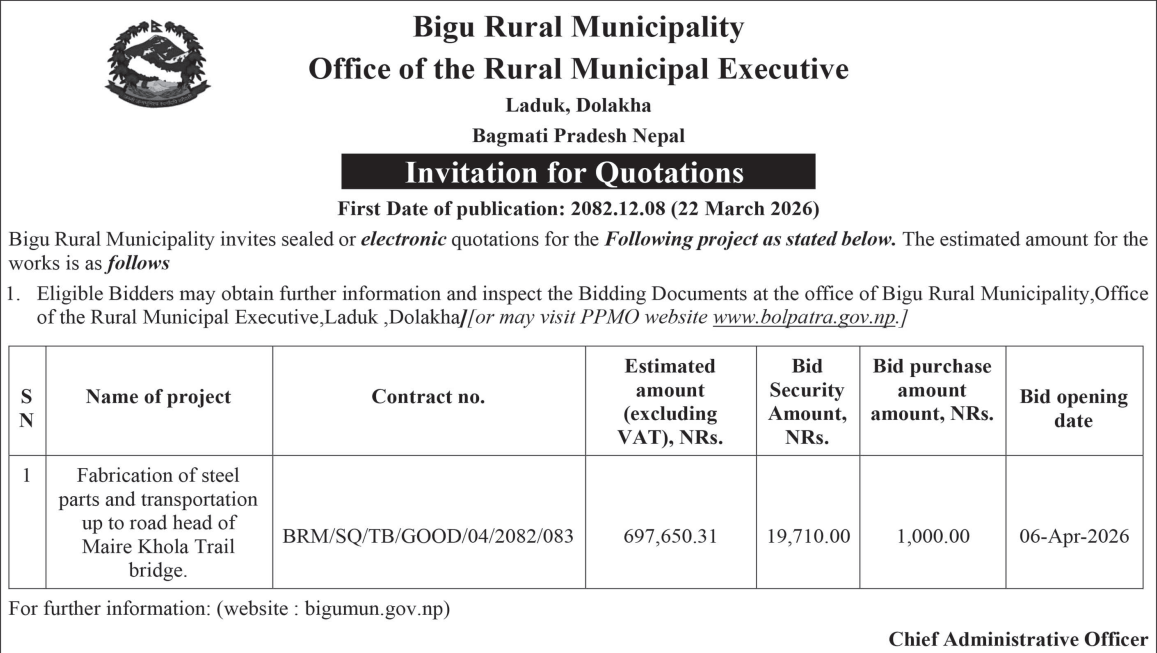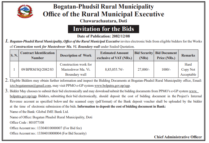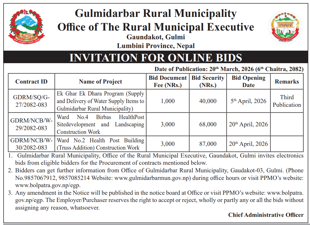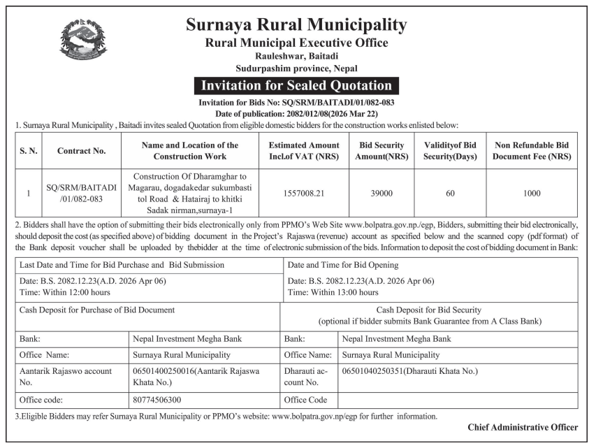 | 155 | Bitthadchir Rural Municipality | Sunkuda Dhari Doba Rural Road Construction | 20/03/2026 | PPMO | 19/04/2026 | Click Here | |