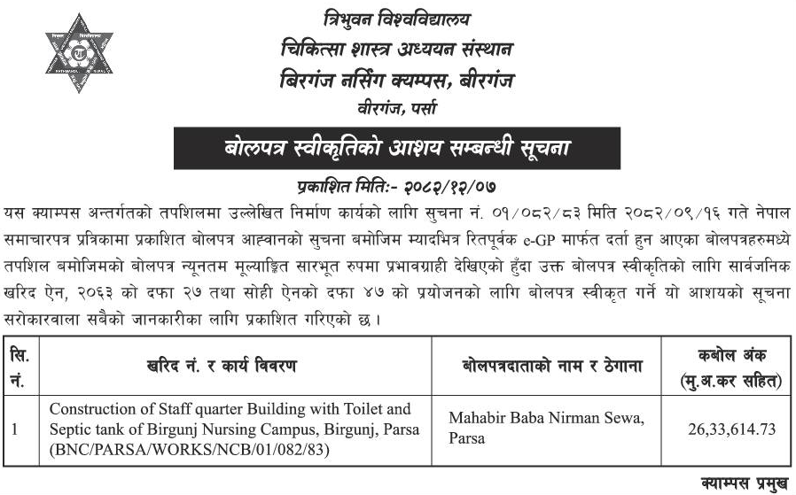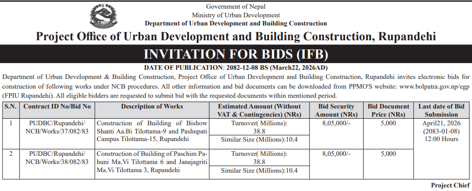 | 233 | FPIU, RUPANDEHI | Lumbini Banijya Campus Butwal-11 Building Construction, Rupandehi | 20/03/2026 | PPMO | 19/04/2026 | Click Here | |