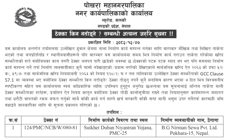 | 173 | Pokhara Metropolitan City Office | Construction of Drainage Works of Damodar Khola, PMC-17 (Contract Id:102/PMC/NCB/W/Purbadhar/082-83) | 20/03/2026 | PPMO | 19/04/2026 | Click Here | |