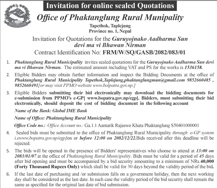 | 227 | Pauwadungma Rural Municipality | Construction of Basic Health Service Center Building of ward 2 and ward 3 | 20/03/2026 | PPMO | 19/04/2026 | Click Here | |