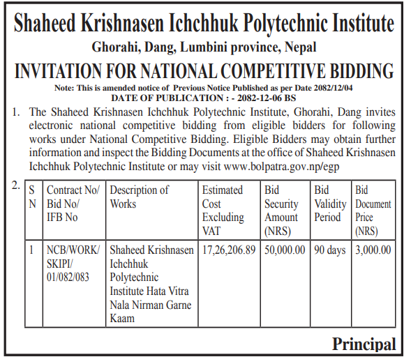 | 222 | Shaheed Krishnasen Ichchhuk Polytechnic Institute | Shaheed Krishnasen Ichchhuk Polytechnic Institute Hata Vitra Nala Nirman Garne Kaam | 20/03/2026 | PPMO | 19/04/2026 | Click Here | |