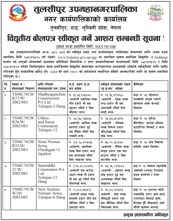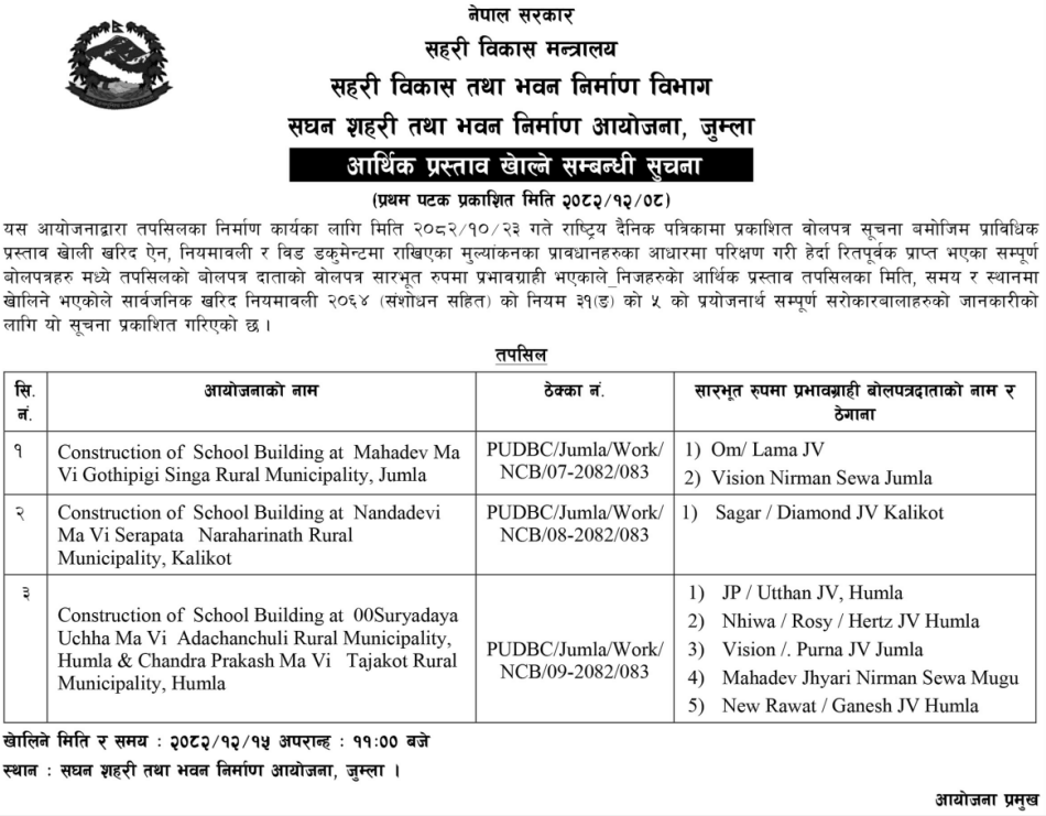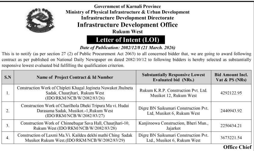 | 51 | Chandannath Municipality , Jumla | Ranarawat Hudai Panimul Sadak Nirman | 20/03/2026 | PPMO | 05/04/2026 | Click Here | |