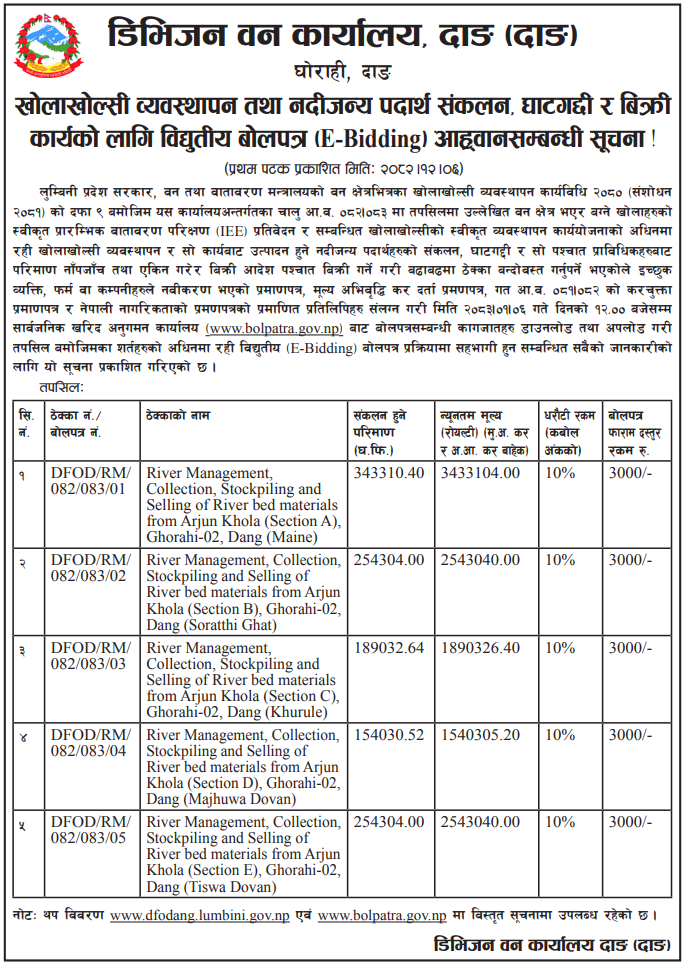 | 190 | Division Forest Office, Nawalparasi (Ba.Su.Pa) | River Management, Collection, Stockpiling and Selling of River bed materials from Arjun Khola (Section C), Khurule,Dang | 20/03/2026 | PPMO | 19/04/2026 | Click Here | |