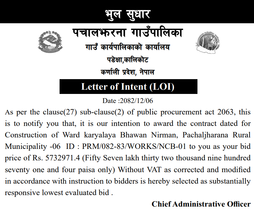 | 225 | Phalewas Municipality | Construction of Basic Health Service Centre Building | 20/03/2026 | PPMO | 19/04/2026 | Click Here | |
