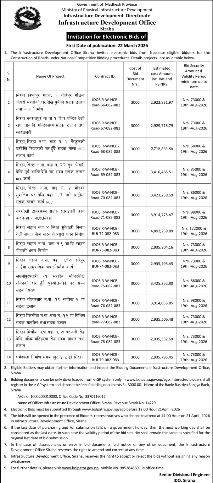| 141 | Infrastructure Development Office, Dhanusha | Upgrading of Roads of Tarapatti, Mithilabihari-07 | 20/03/2026 | PPMO | 20/04/2026 | Click Here | |