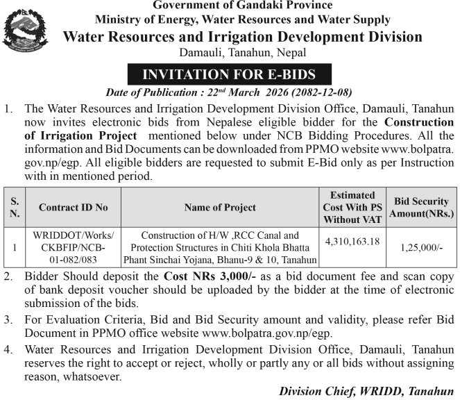 | 149 | Water Supply, Irrigation & Energy Development Office, Dailekh | Construction of Canal Lining and Associated Structures at Dhakale Kulo Irrigation Project, Bihadi-02, Parbat | 20/03/2026 | PPMO | 20/04/2026 | Click Here | |