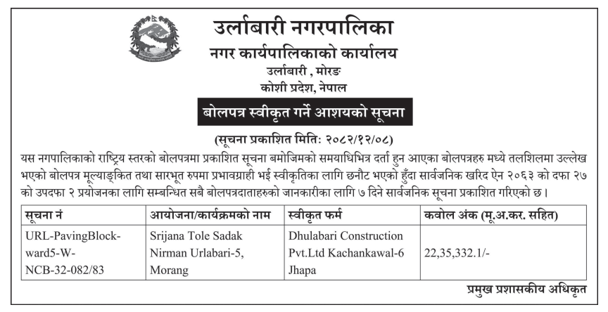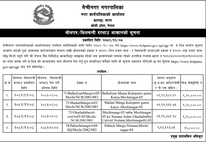 | 183 | Birtamode Municipality, Office of Municipal Executive, Birtamod Jhapa | Construction of Interlocking Concrete Paver Block Roads at Various Locations within Birtamode Municipality, Ward No. 01 & 05, Jhapa | 20/03/2026 | PPMO | 19/04/2026 | Click Here | |