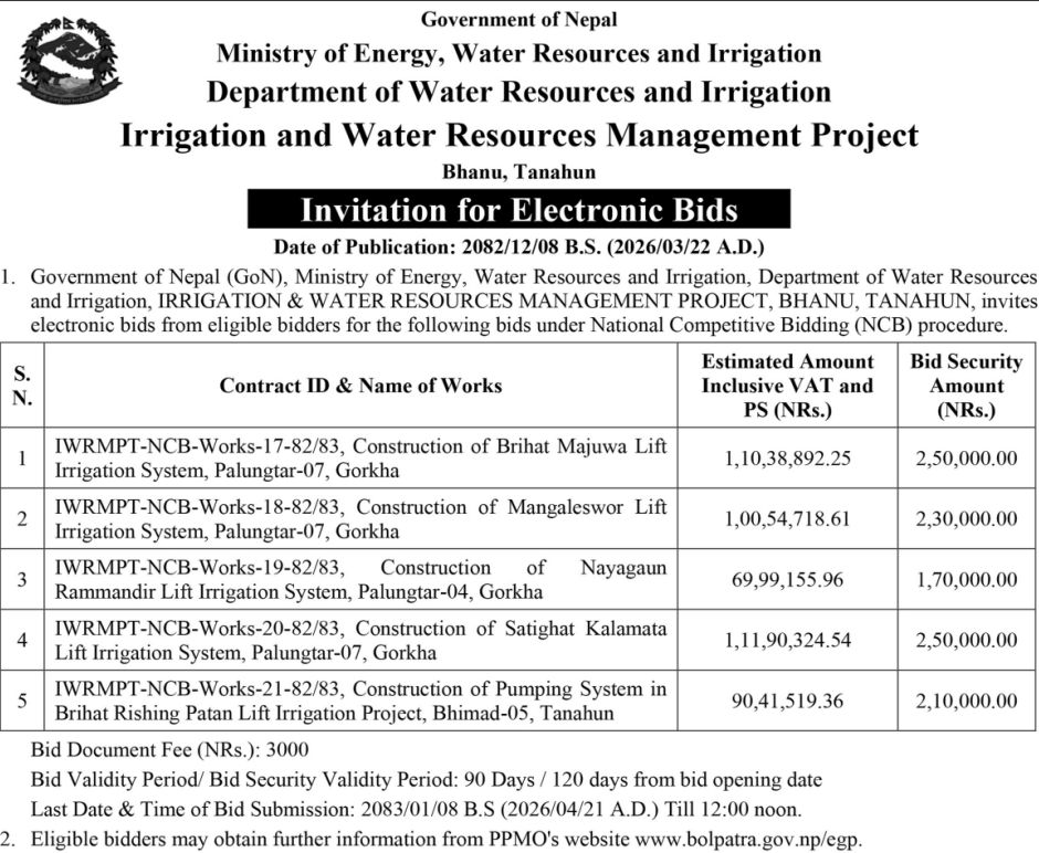 | 148 | Water Supply, Irrigation & Energy Development Office, Dailekh | Construction of Irrigation Canal and Protection Works at Bardilang Irrigation Project, Paiyun-1,Takalak,Parbat | 20/03/2026 | PPMO | 20/04/2026 | Click Here | |