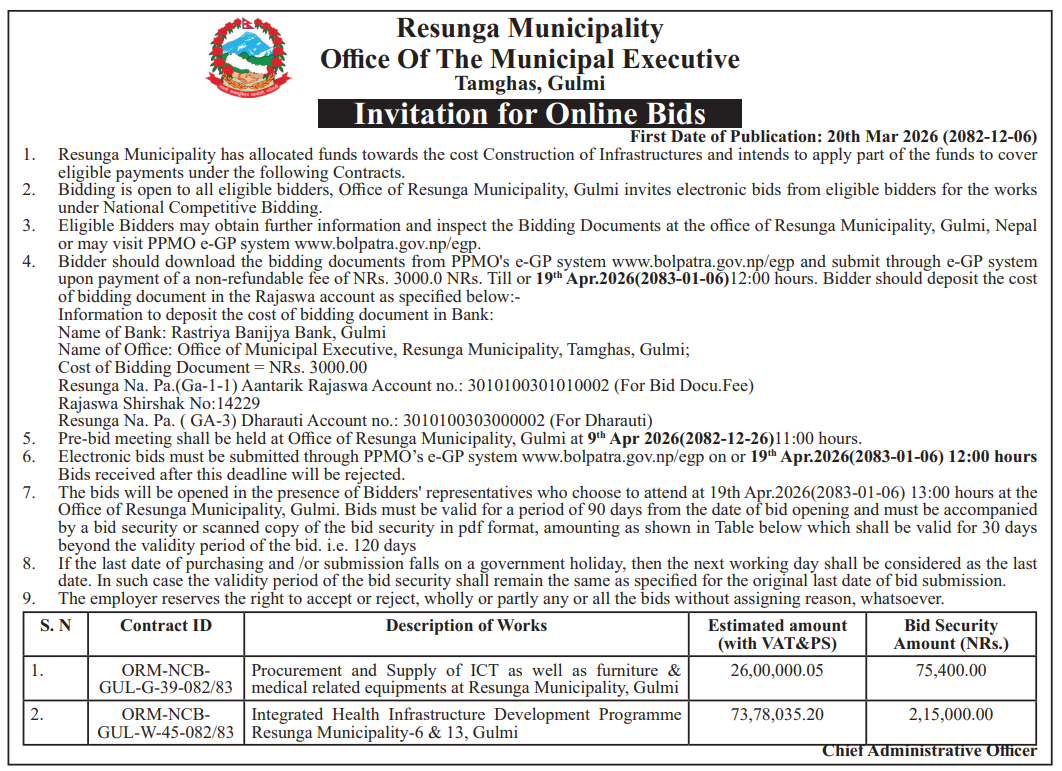| 224 | Office of Resunga Municipality | Integrated Health Infrastructure Development Programme Resunga Municipality-6 & 13, Gulmi | 20/03/2026 | PPMO | 19/04/2026 | Click Here | |