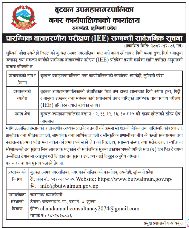 | 168 | kalika Municipality Office , Chitwan | Gopi Lamako Ghar dekhi Udaypur Sa.Ban kathepul dekhi Rumba tol sadak,Kalika-07 | 20/03/2026 | PPMO | 19/04/2026 | Click Here | |