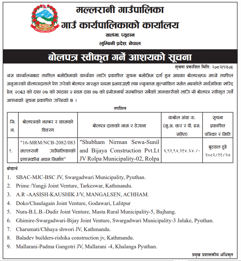 | 11 | Banganga Municipality Office | Bangain Adhuro Covered Hall, Ward 7 | 20/03/2026 | PPMO | 05/04/2026 | Click Here | |