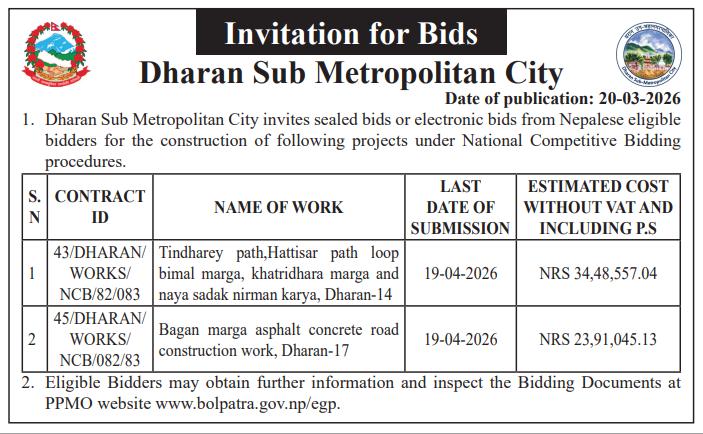 | 157 | Dharan Sub- Metropolitan City Office, Dharan | Dharan Khanepaniko lagi booster pump jadan karya,Dharan | 20/03/2026 | PPMO | 19/04/2026 | Click Here | |