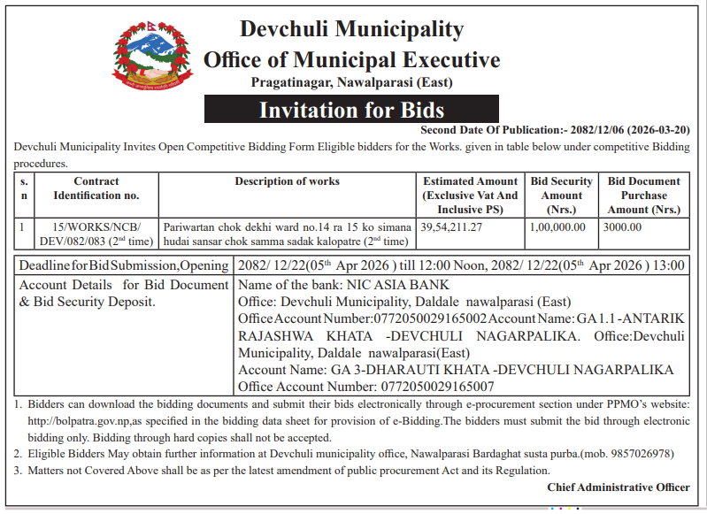 | 15 | Devchuli Municipality, Nawalparasi-East | Pariwartan chok dekhi ward no.14 ra 15 ko simana hudai sansar chok samma sadak kalopatre(2ndtime) | 20/03/2026 | PPMO | 05/04/2026 | Click Here | |