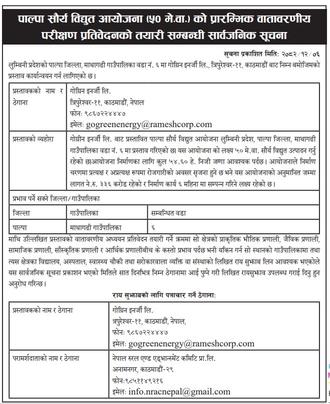 | 175 | Sunwal Municipality Office | Gyanjyoti Dekhi Dhusa Jane Bato ra Ward Karyalaya Agadhi Hudai Dhusa Jodne Bato,Sunwal -11 | 20/03/2026 | PPMO | 19/04/2026 | Click Here | |