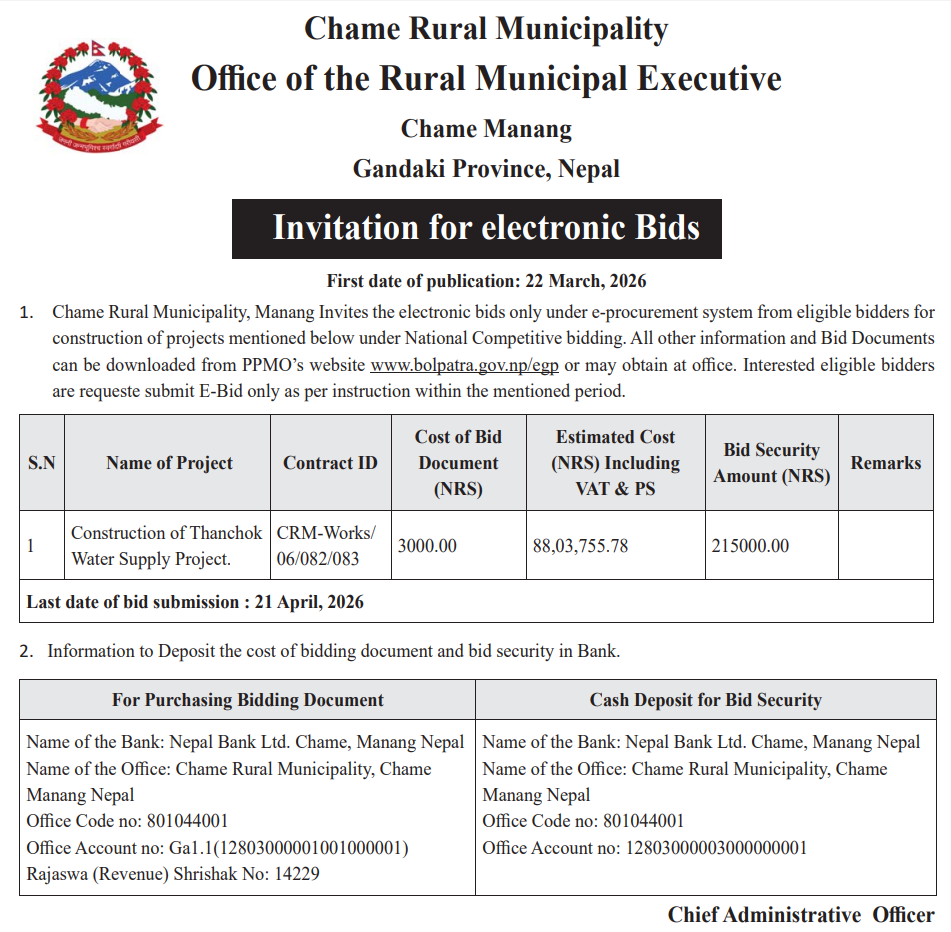 | 220 | Manang Ngisyang Rural Municipality, Manang | MNRM/WORKS/NCB/01/2082/083 | 20/03/2026 | PPMO | 19/04/2026 | Click Here | |