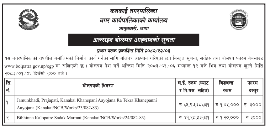 | 214 | kankai Municipality | Jamunkhadi, Prajapati, Kanakai Khanepani Aayojana Ra Tekra Khanepanni Aayojana | 20/03/2026 | PPMO | 19/04/2026 | Click Here | |