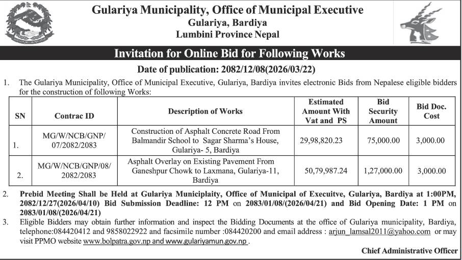 | 37 | Bheemdatt Municipality | Various Road Gravelling Works, Ward no. 6 (26 Toles) | 20/03/2026 | PPMO | 05/04/2026 | Click Here | |