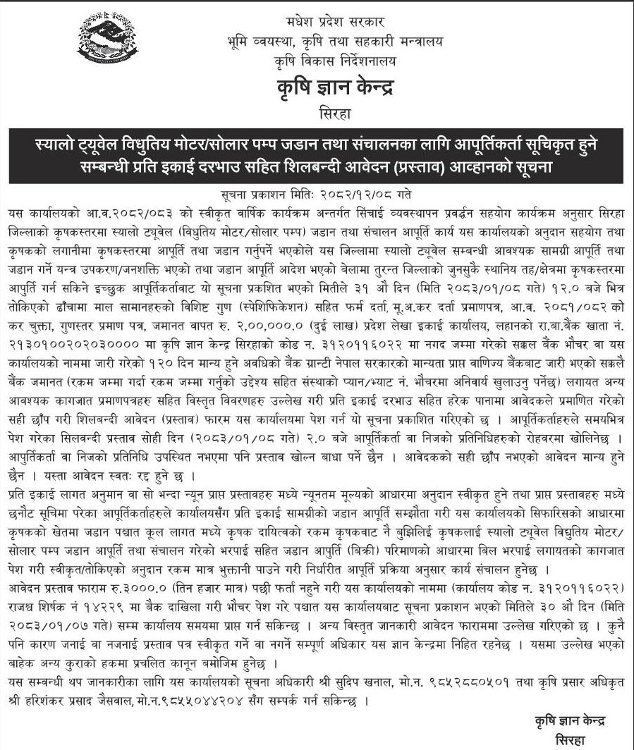 | 147 | Water Supply, Irrigation & Energy Development Office, Dailekh | Construction of Intake, Pipe Line, RCC Resevoir Tank, Stand Post, Supply and Installation of Solar Water Pumping System and other Water Supply Structures | 20/03/2026 | PPMO | 20/04/2026 | Click Here | |