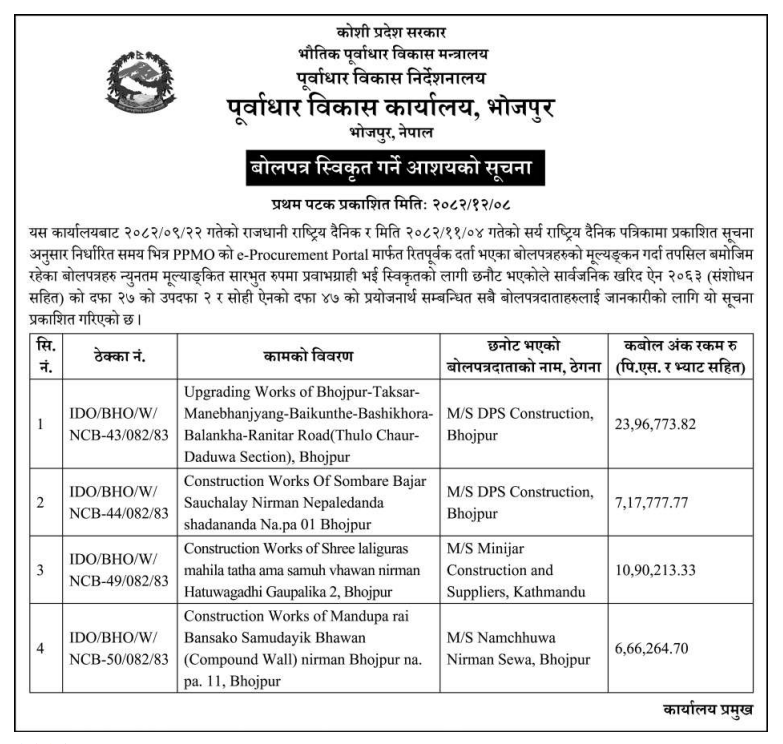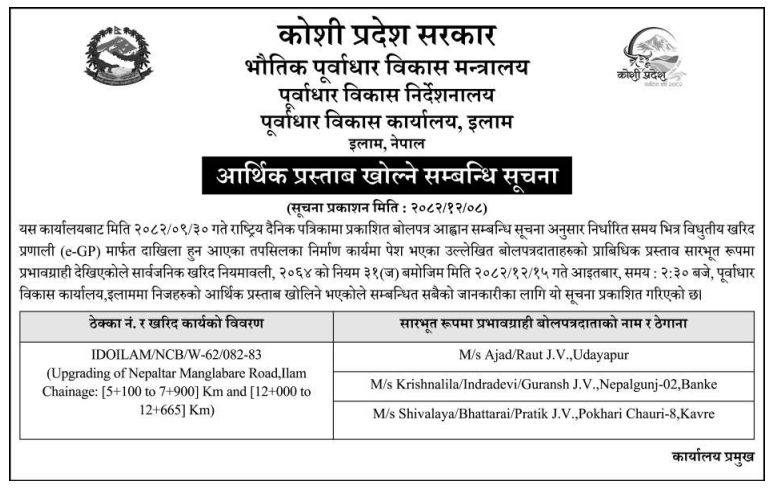 प्रदेश १ मा प्रकाशित निर्माण सम्बन्धी बोलपत्र तथा आशयका सुचनाहरु