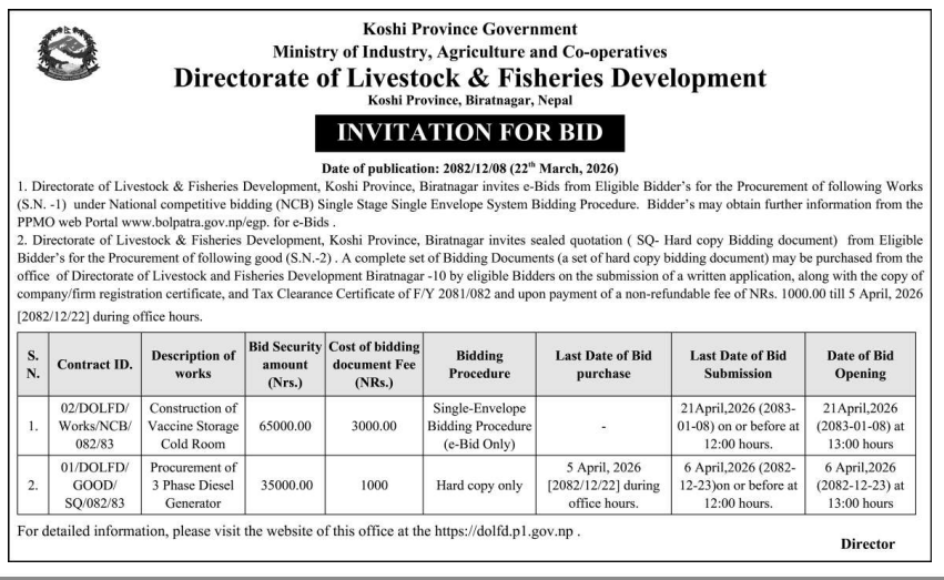 निर्माण सम्बन्धी प्रकाशित सम्पूर्ण ठेक्का टेन्डर तथा बोलपत्र सुचनाहरु प्रदेश अनुसार 22/03/2026 (Sunday)