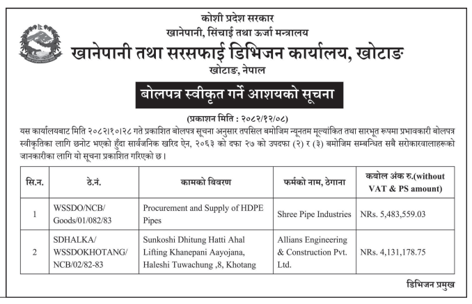 | 6 | Sunkoshi Rural Municipality, Okhaldhunga | Kirpetar Khanepani Yojana Sunkoshi 9 Kakani | 20/03/2026 | PPMO | 05/04/2026 | Click Here | |