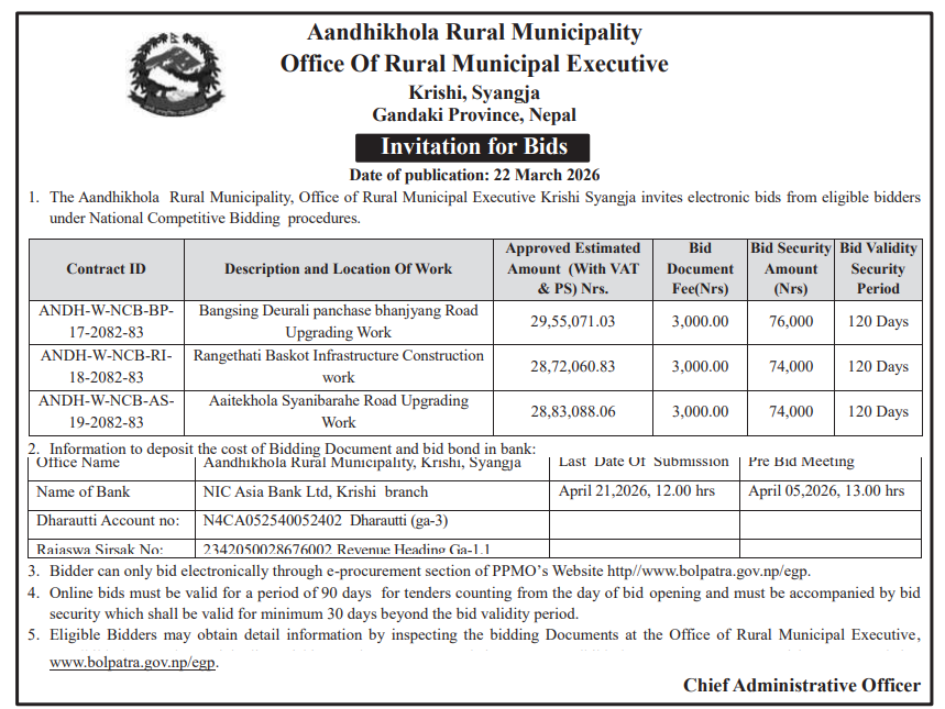 | 21 | Pokhara Metropolitan City Office | Upgrading of Road from Firke -Samparka Marga-Kolbari Marga,PMC-07 (Contract ID:95/PMC-Re/SQ/W/Purbadhar/082-83) | 20/03/2026 | PPMO | 05/04/2026 | Click Here | |