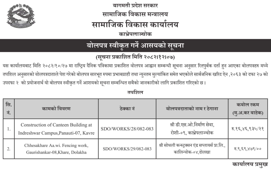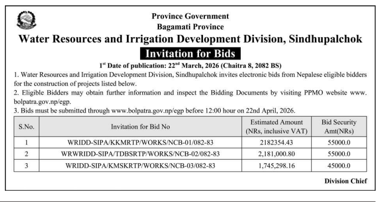 प्रदेश ३ मा प्रकाशित निर्माण सम्बन्धी बोलपत्र तथा आशयका सुचनाहरु