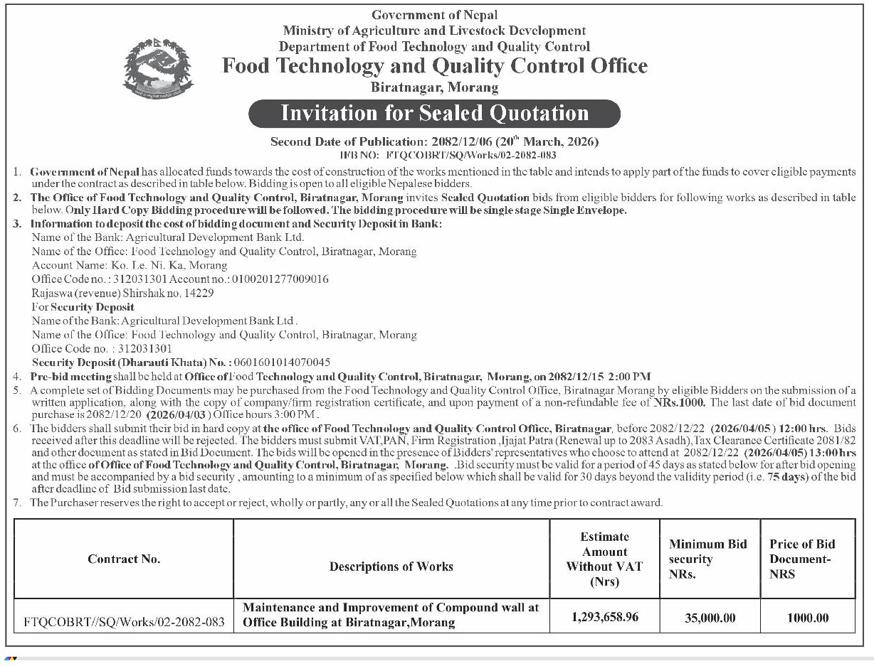 | 228 | FPIU, RUPANDEHI | Repair/Reconstruction/Restoration Work of Loksewa Aayog, Butwal Office Building Damaged during the Gen-Z movement as per the Study Report | 20/03/2026 | PPMO | 19/04/2026 | Click Here | |