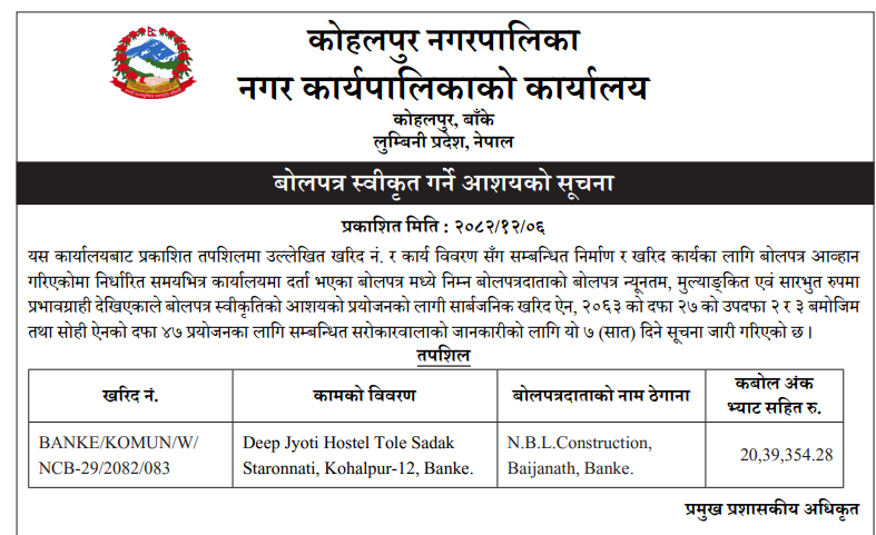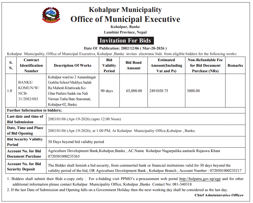 | 178 | Kohalpur Municipality Office,Banke | Kohalpur ward no 2 Aanandnagar Gorkha School Mukhya Sadak Ra Mahesh Khatiwada Ko Ghar Pashim Sadak ma Nali Nirman Tatha Bato Staronnati, Kohalpur-02, Banke | 20/03/2026 | PPMO | 19/04/2026 | Click Here | |