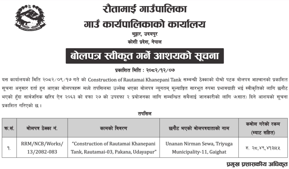 | 22 | Rupani Gaunpalika | Unfinished ward office building construction, Rupani 4 | 20/03/2026 | PPMO | 05/04/2026 | Click Here | |