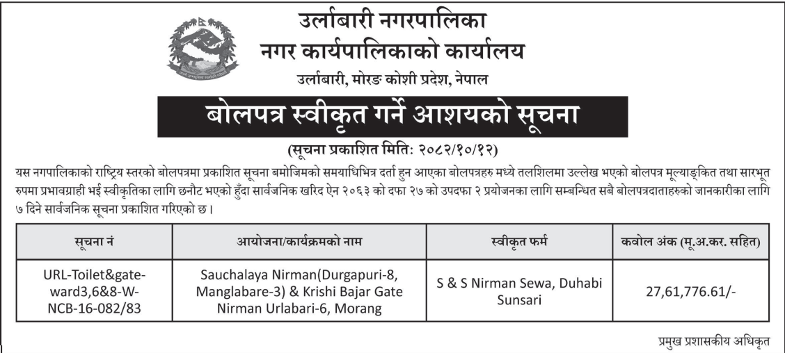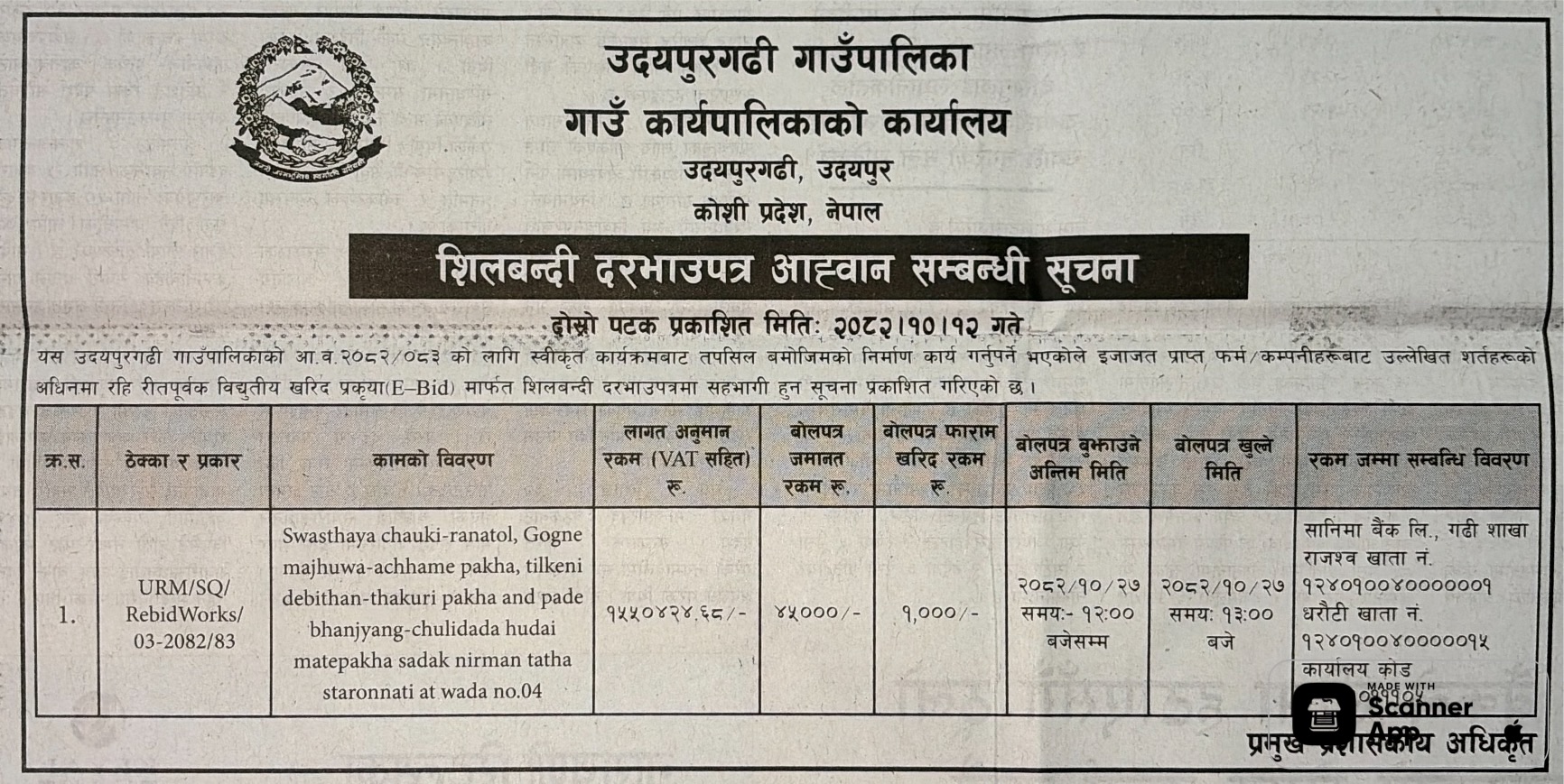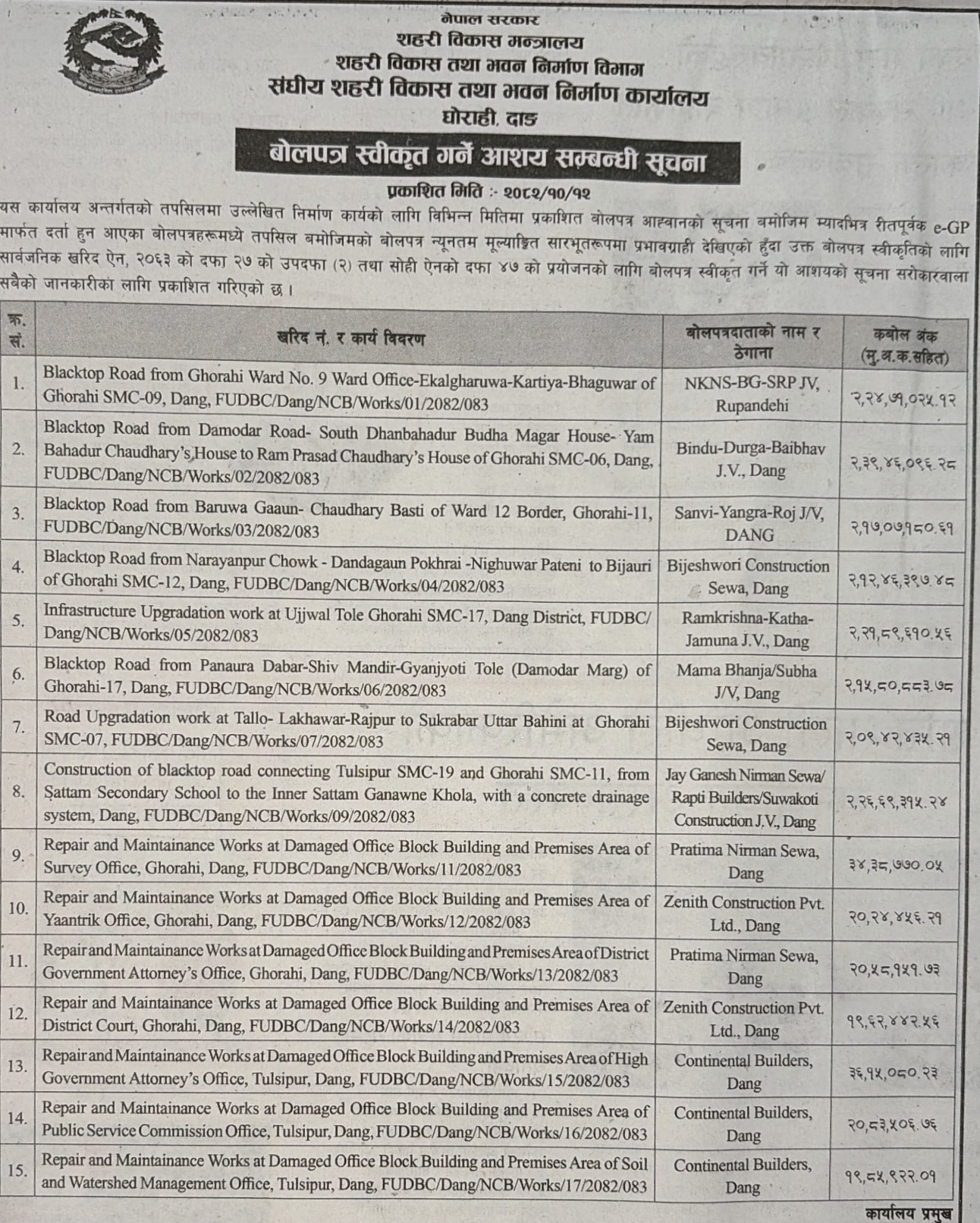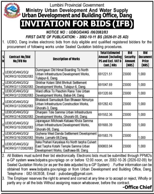 | 2 | Urban Development & Building Office Ghorahi, Dang | Ilaka Prahari Karyalaya Ko North tarpha Culvert East Tarpha Kotahi Temple Samma Urban Development Works,Gadhawa-06,Dang. | 25/01/2026 | PPMO | 09/02/2026 | Click Here | |