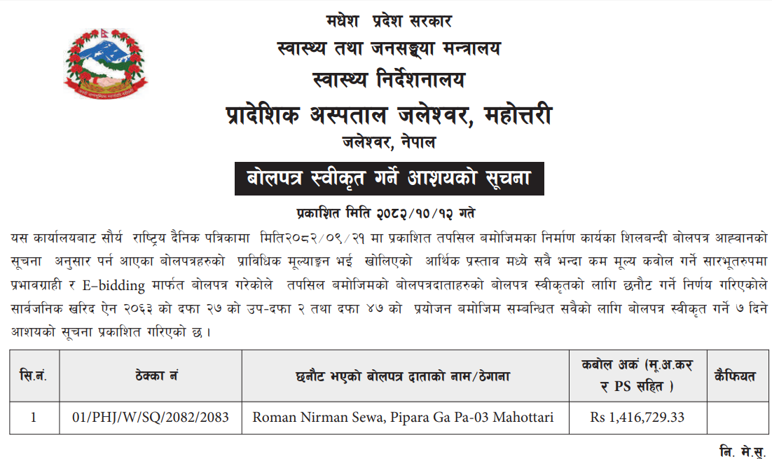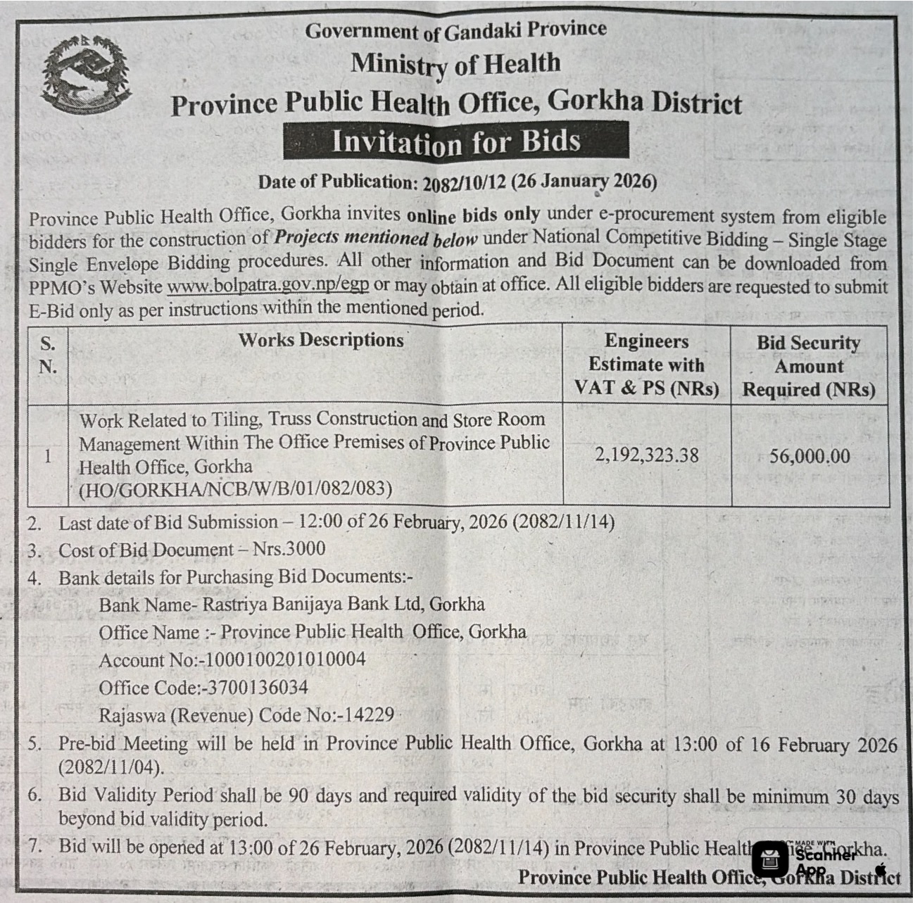 | 7 | Indrasarowar Rural Municipality, Makawanpur | Construction of Ramchandra vanjyang health centre | 25/01/2026 | PPMO | 08/02/2026 | Click Here | |