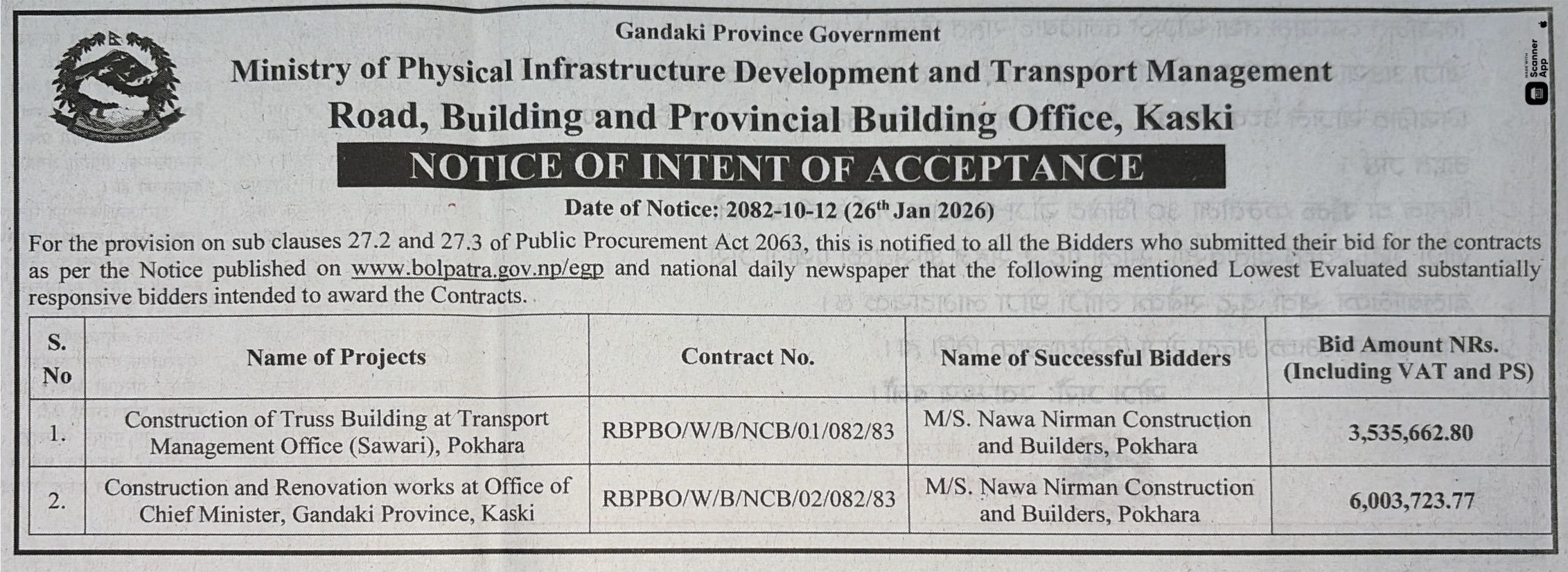 प्रदेश ४ मा प्रकाशित निर्माण सम्बन्धी बोलपत्र तथा आशयका सुचनाहरु