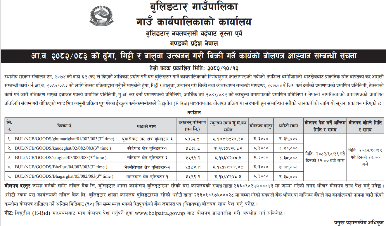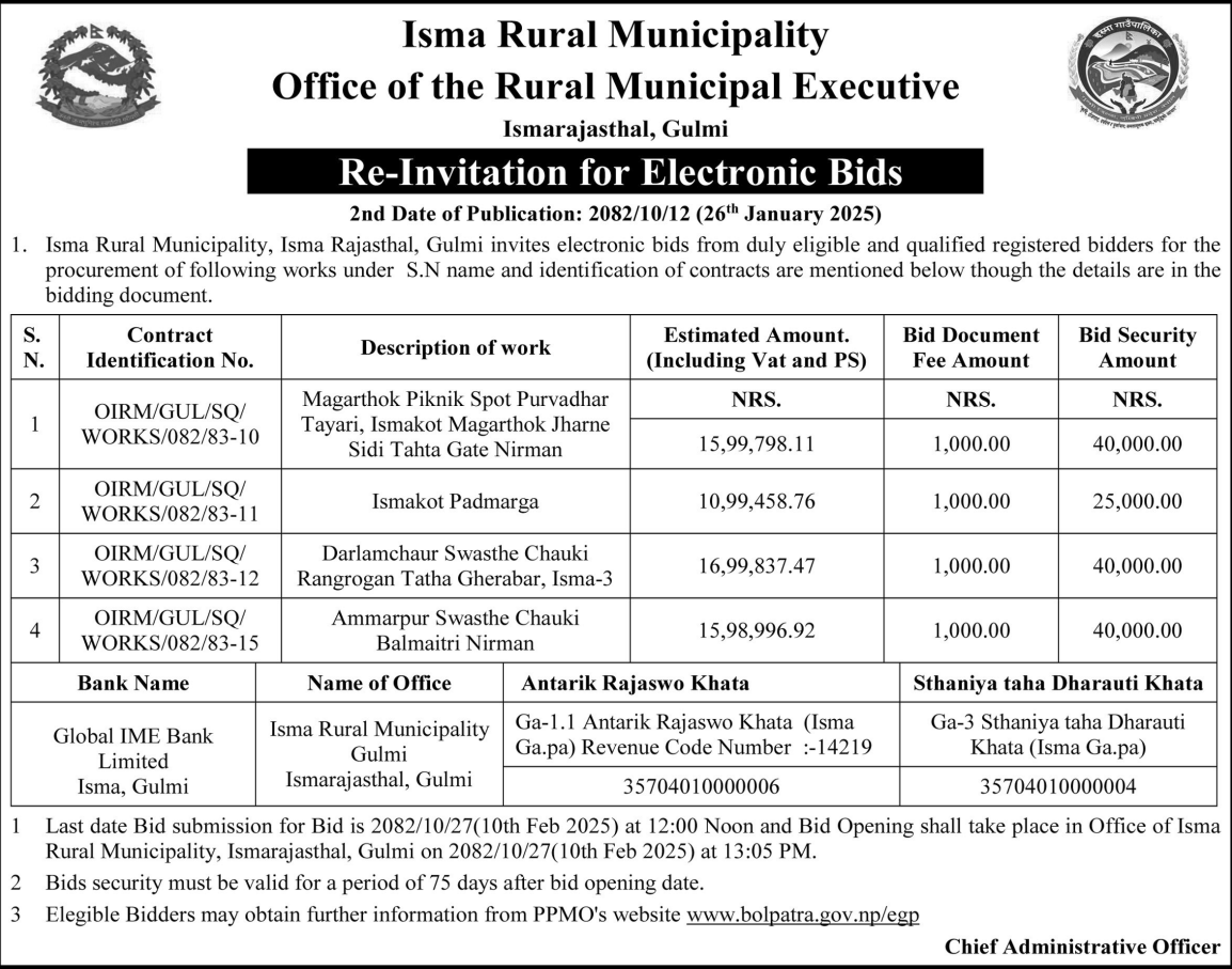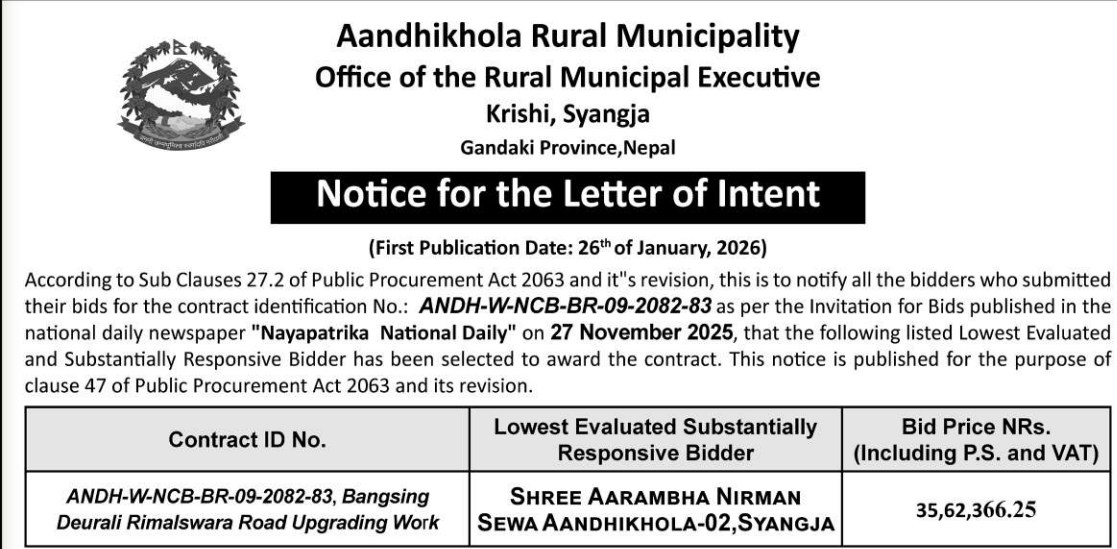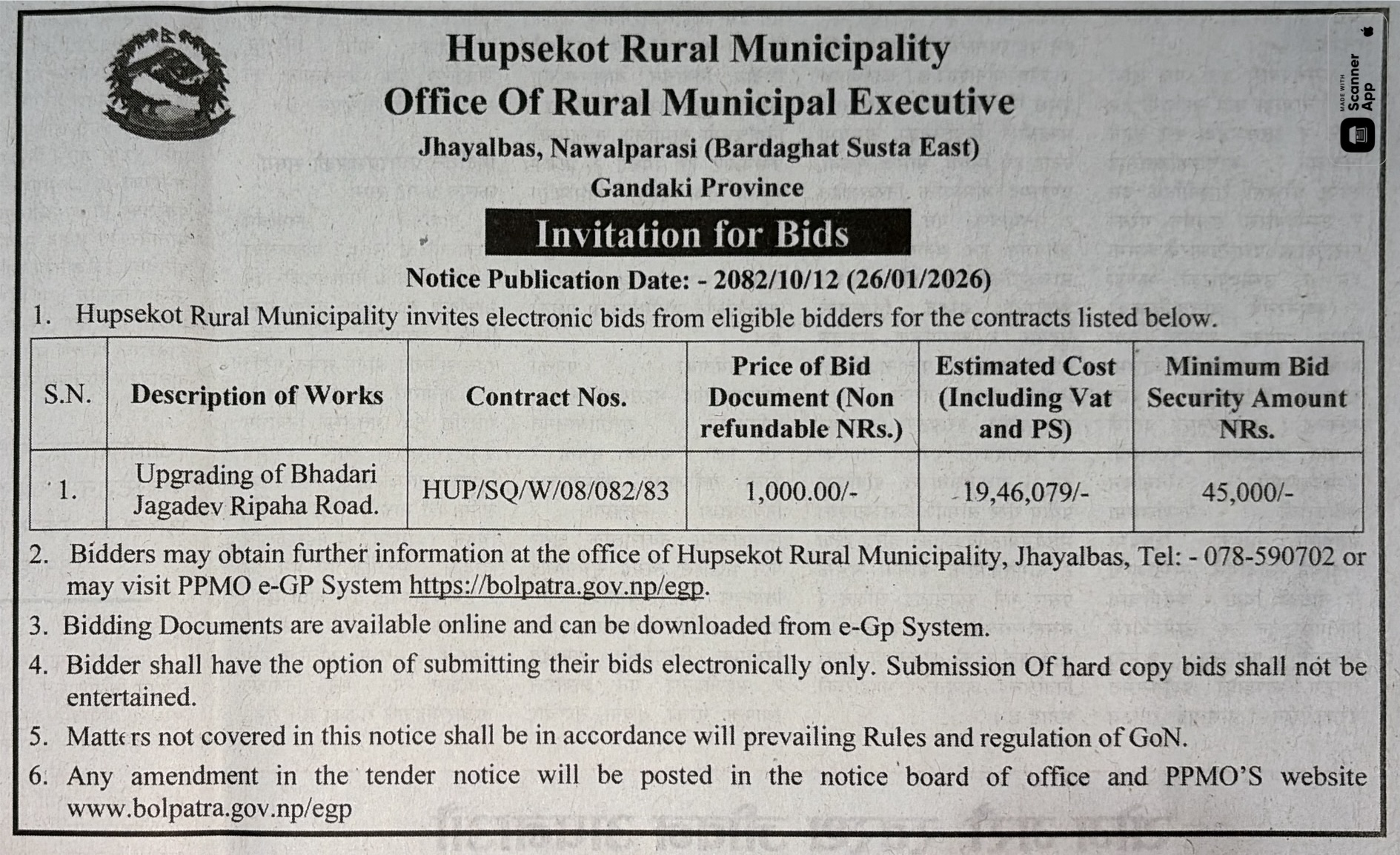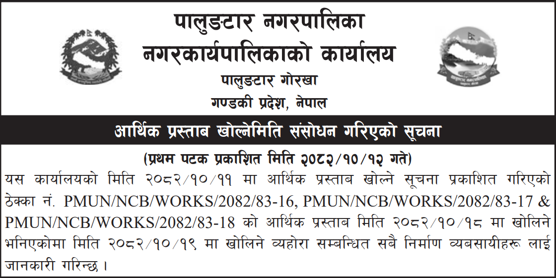 | 120 | Phalebas Municipality Office, Gandaki Province, PARBAT; | Nuwar Baajabari Khoriya Chuchundeurali Road | 25/01/2026 | PPMO | 24/02/2026 | Click Here | |