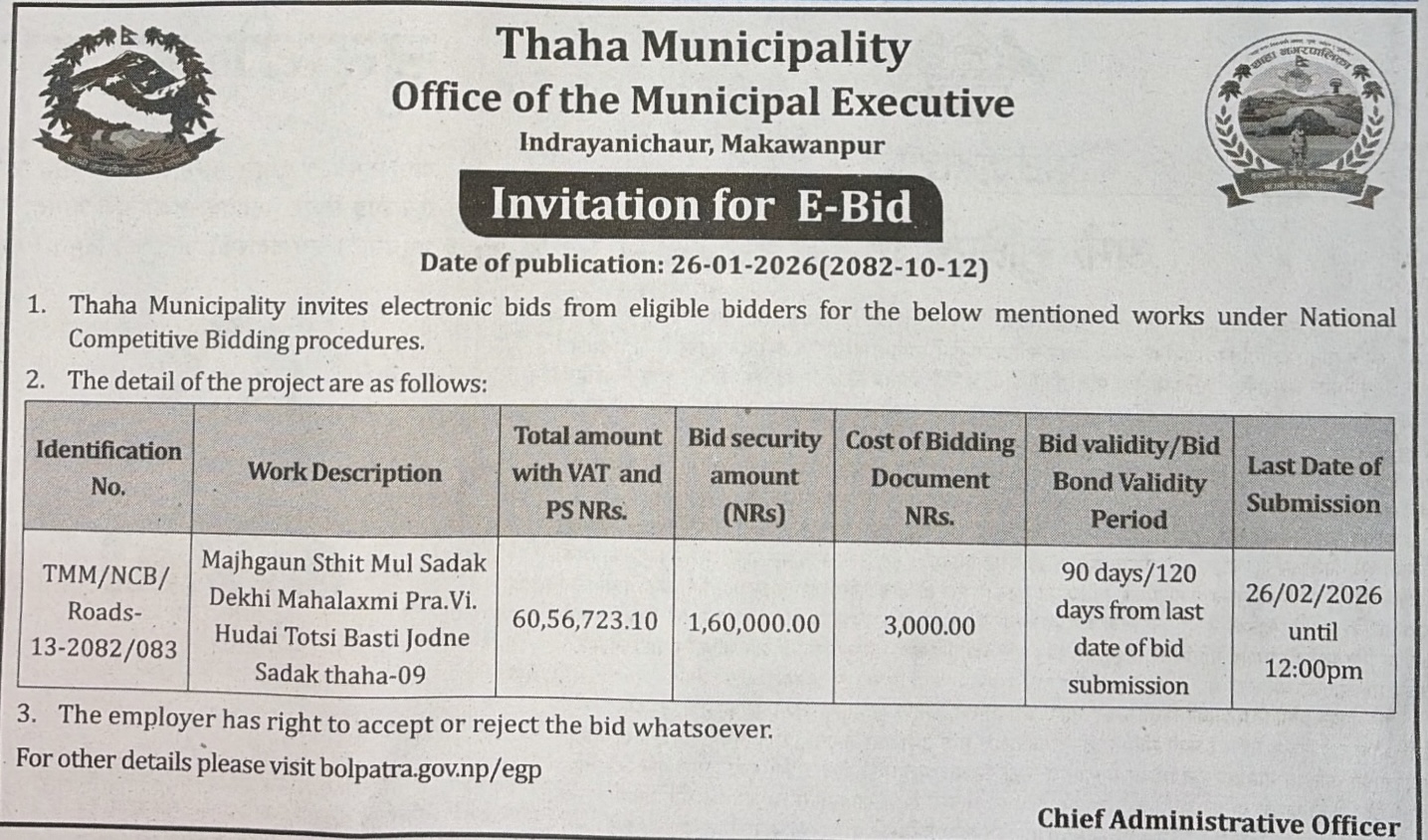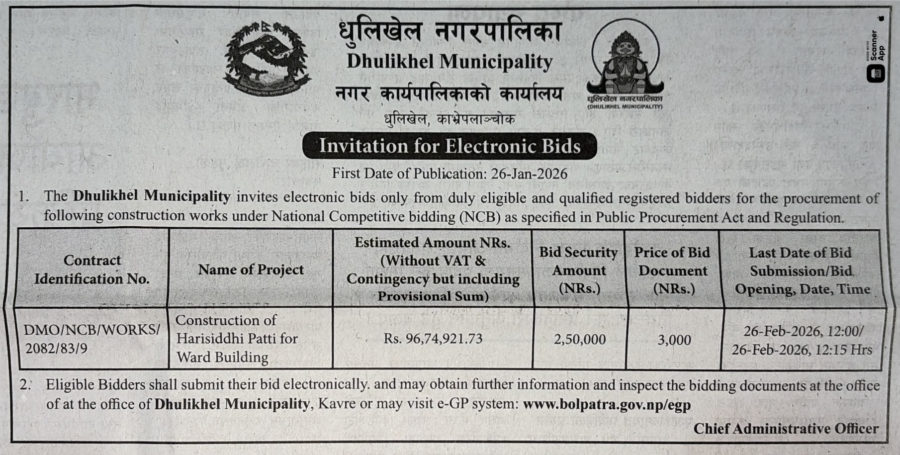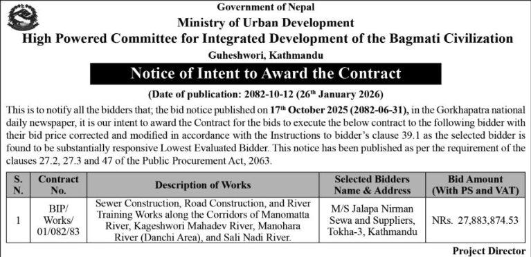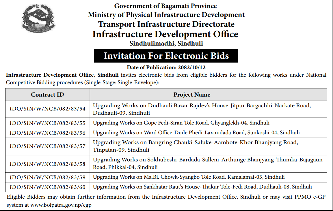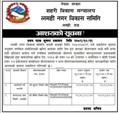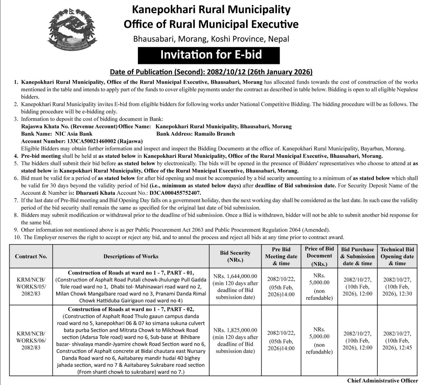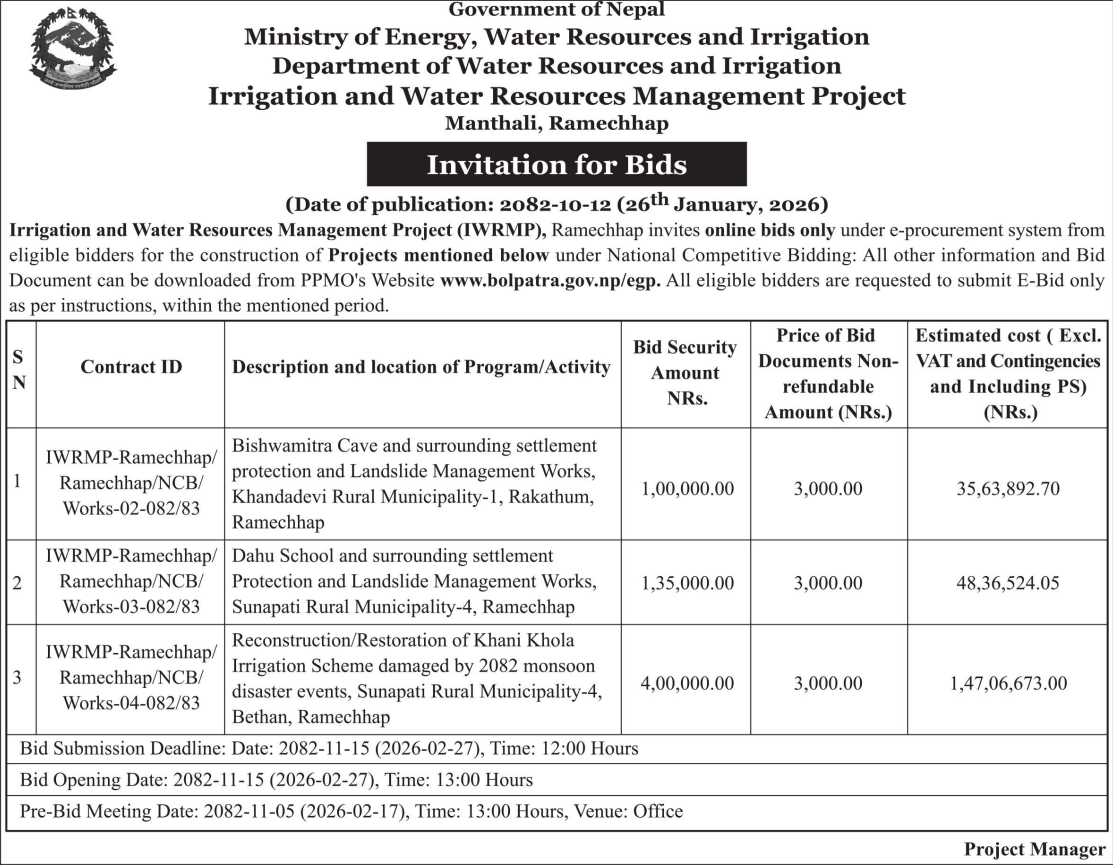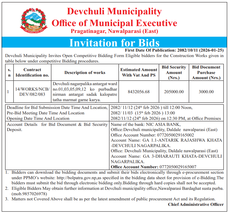 | 155 | Nagarjun Municipality Office, Bagmati Province, KATHMANDU; | Ward No. 3 Ajima Mandir Parisarma Purbadhar Staronnati | 25/01/2026 | PPMO | 09/02/2026 | Click Here | |