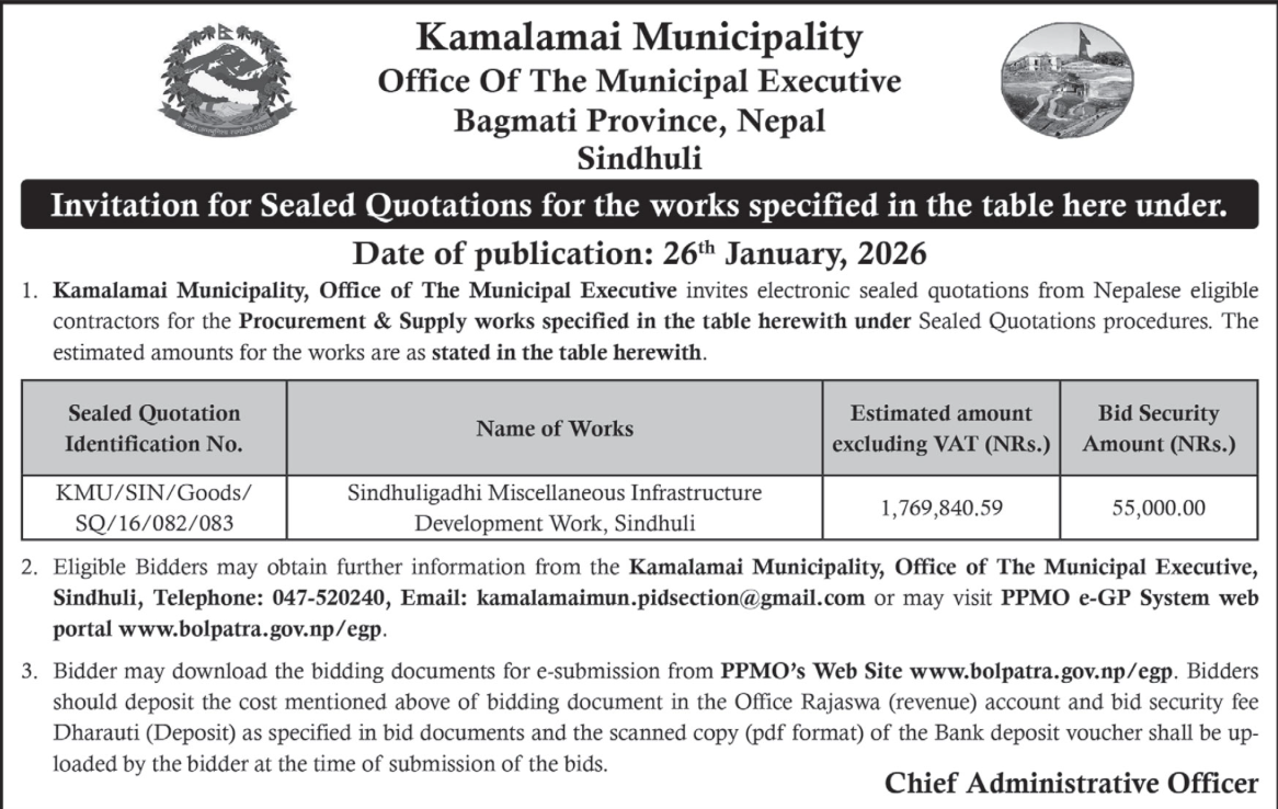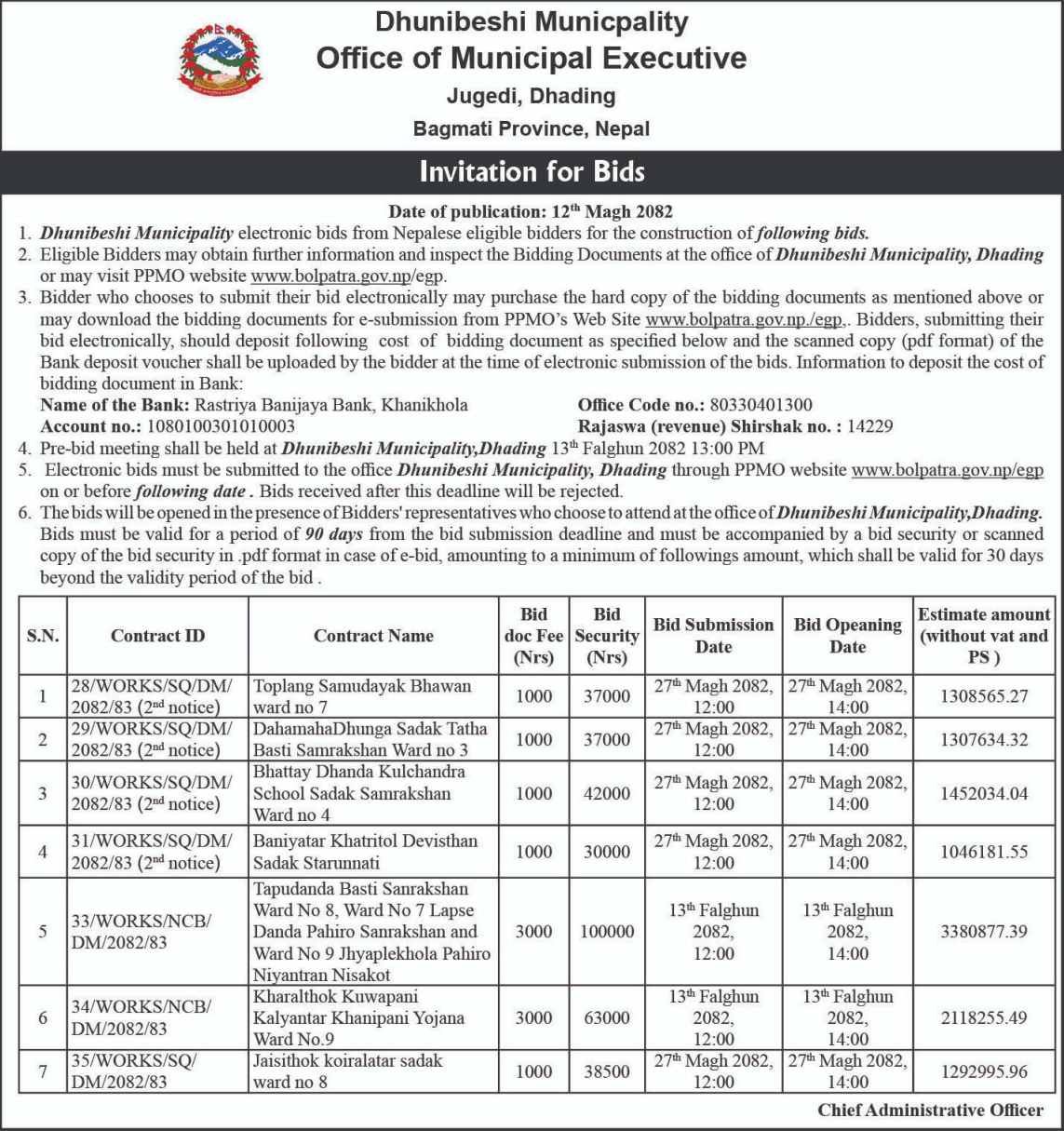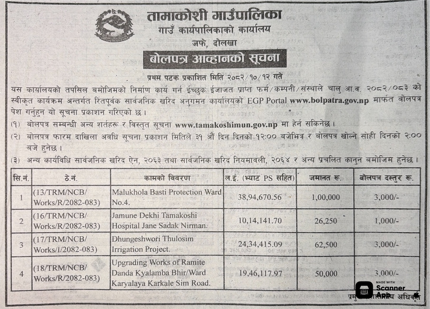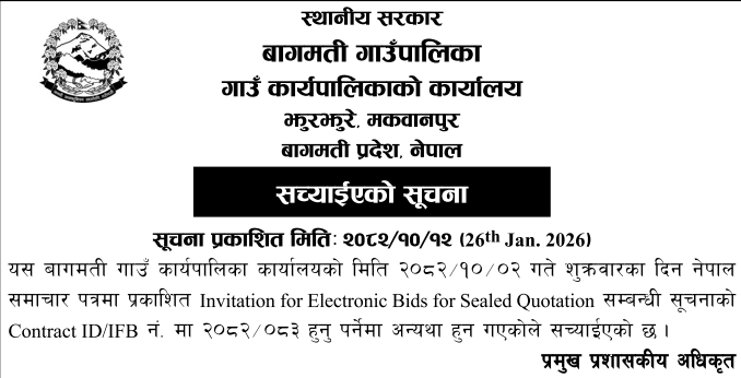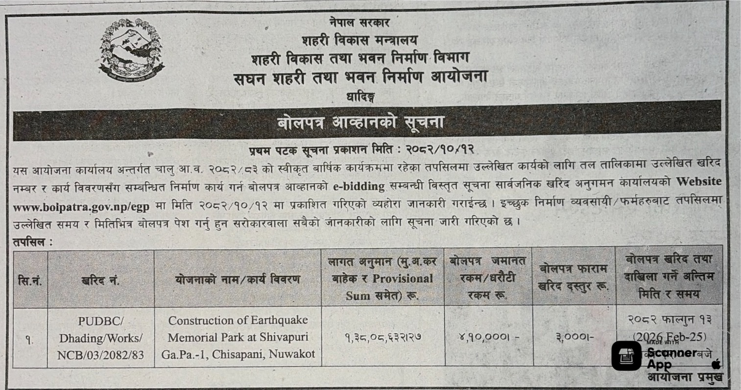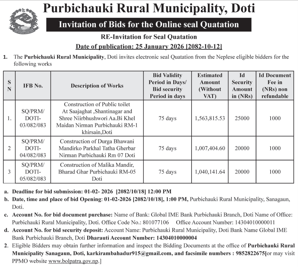 | 155 | Nagarjun Municipality Office, Bagmati Province, KATHMANDU; | Ward No. 3 Ajima Mandir Parisarma Purbadhar Staronnati | 25/01/2026 | PPMO | 09/02/2026 | Click Here | |