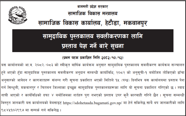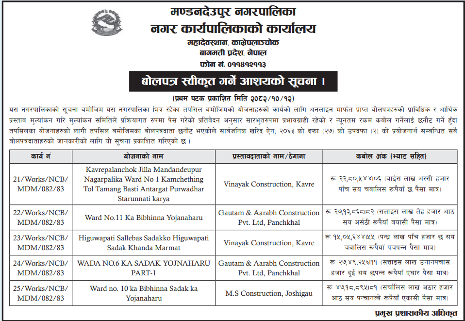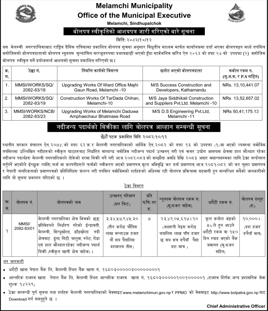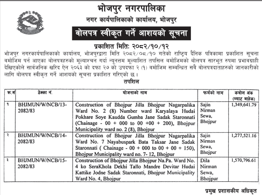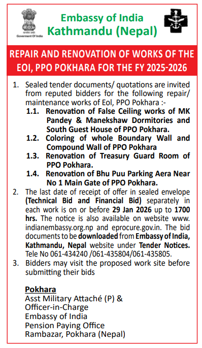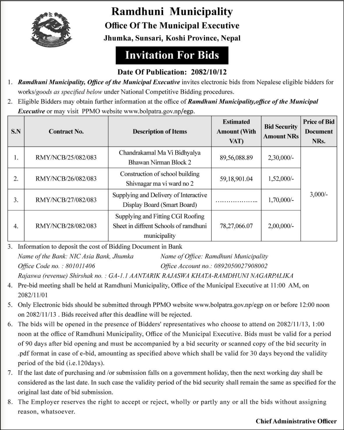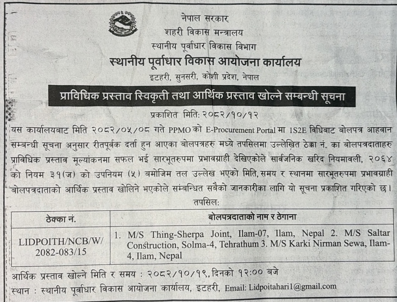 | 155 | Nagarjun Municipality Office, Bagmati Province, KATHMANDU; | Ward No. 3 Ajima Mandir Parisarma Purbadhar Staronnati | 25/01/2026 | PPMO | 09/02/2026 | Click Here | |