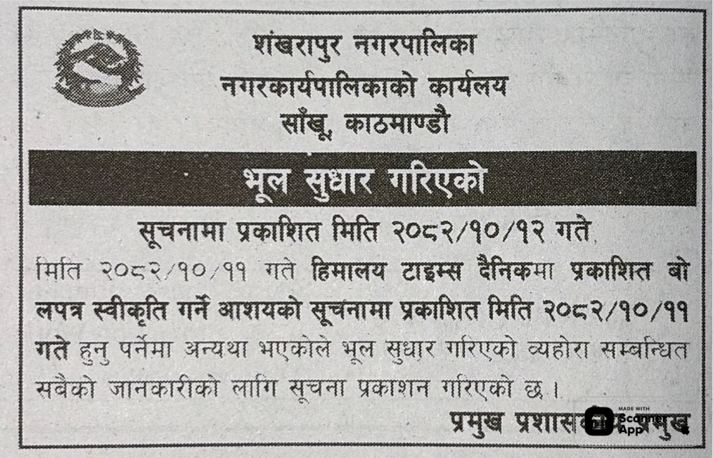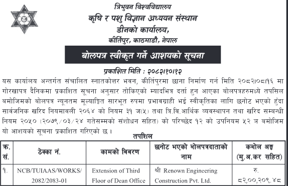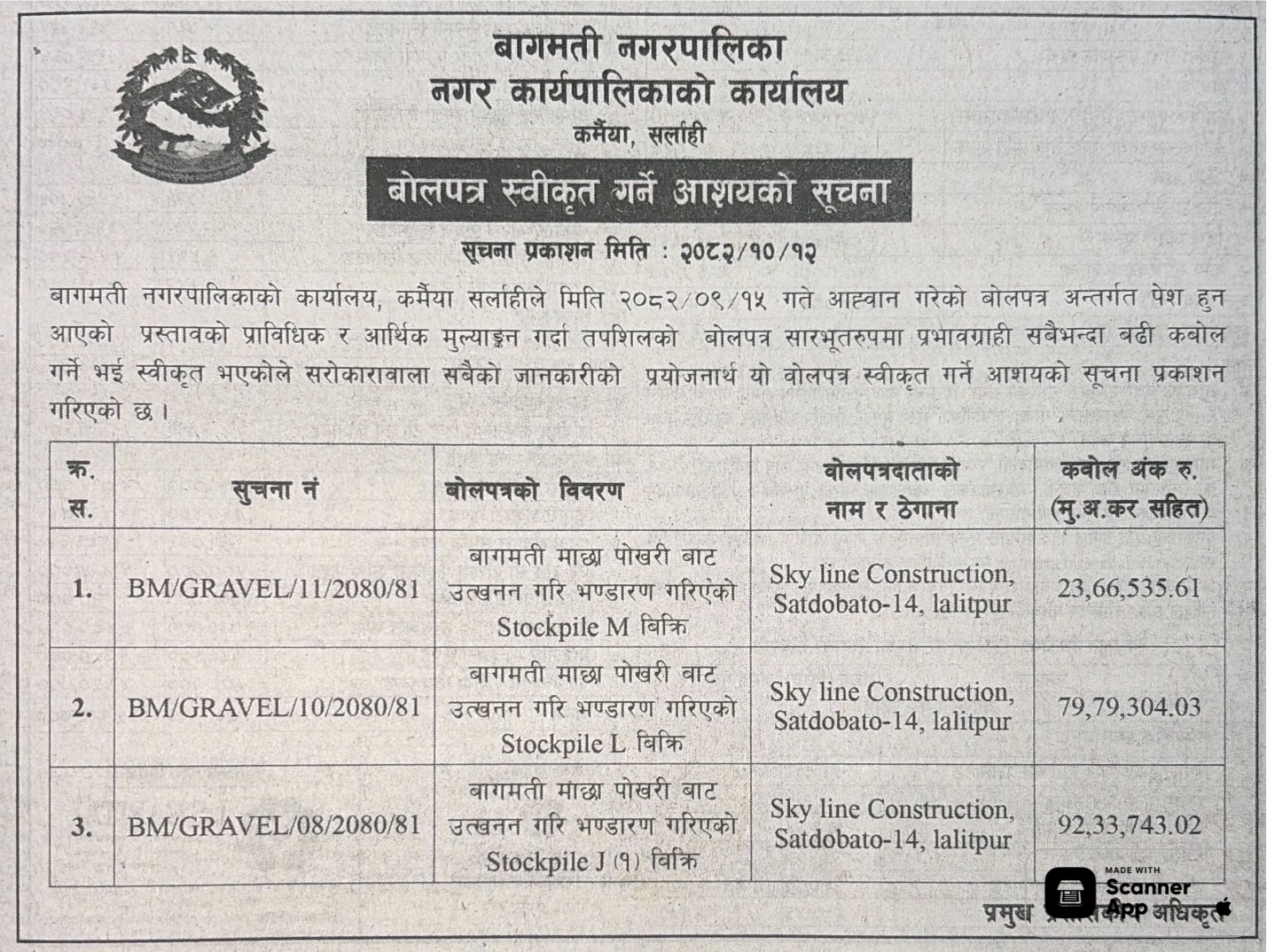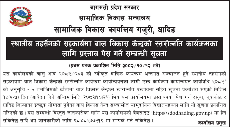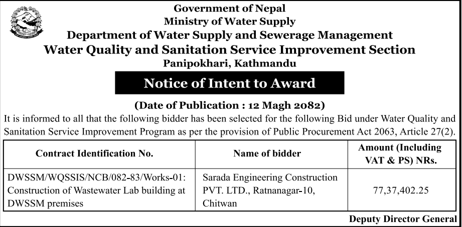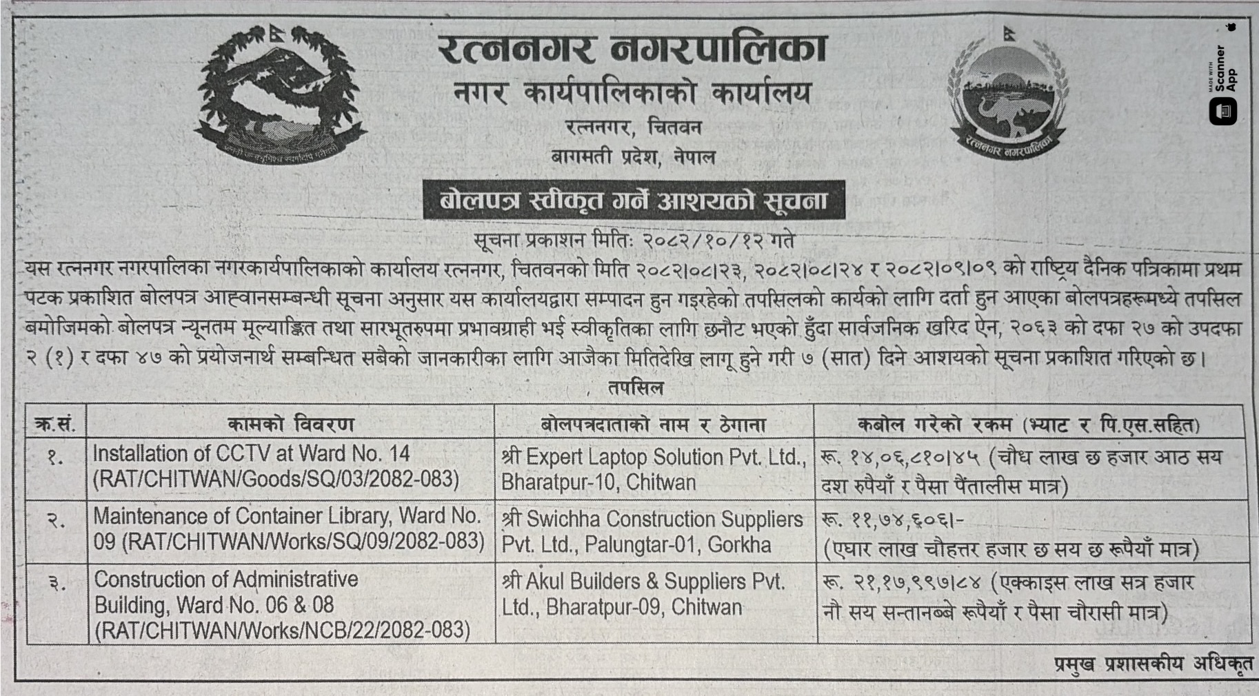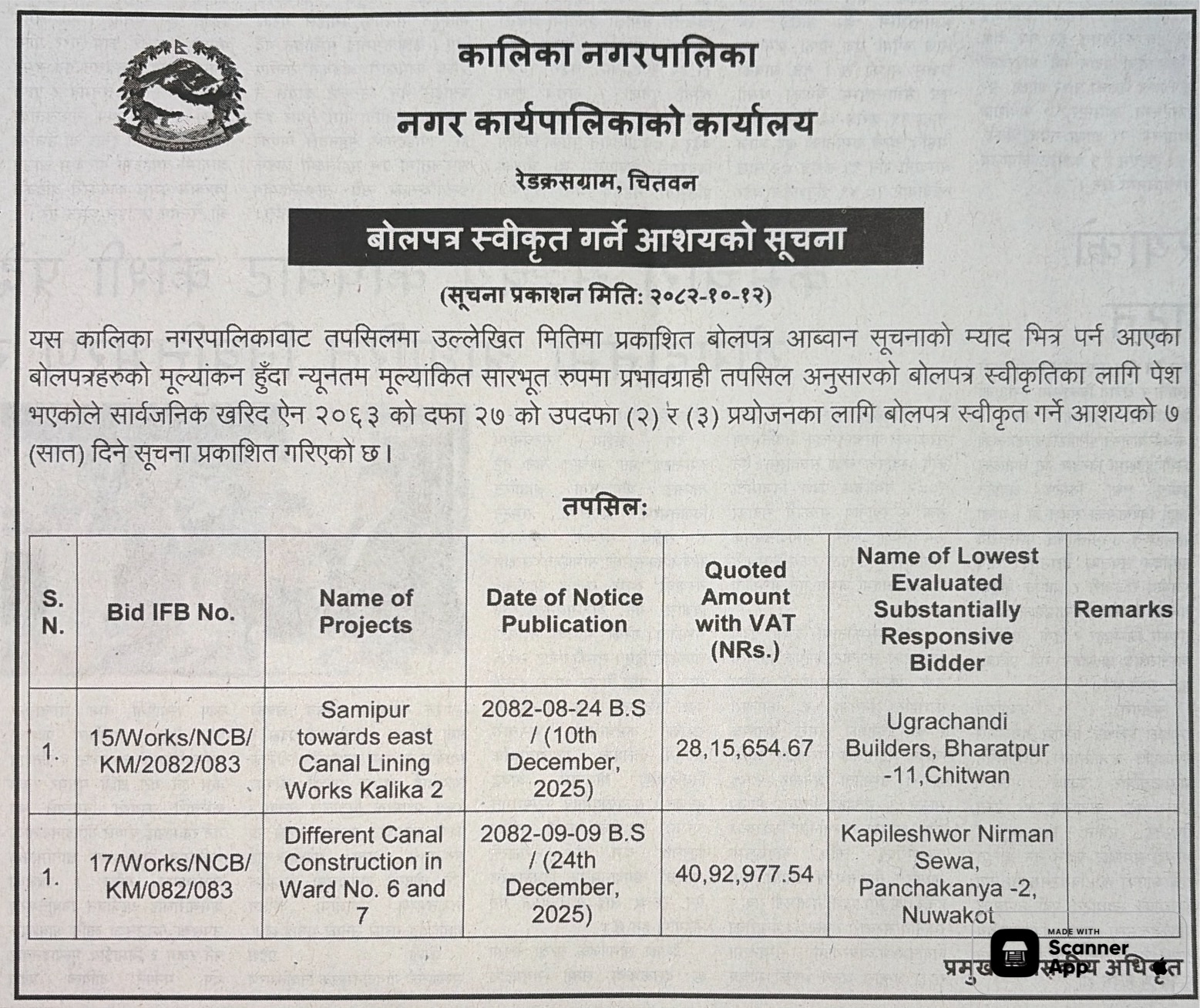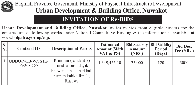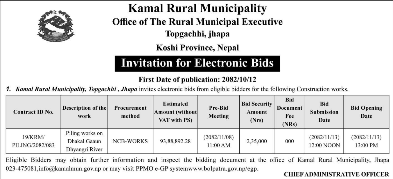 | 155 | Nagarjun Municipality Office, Bagmati Province, KATHMANDU; | Ward No. 3 Ajima Mandir Parisarma Purbadhar Staronnati | 25/01/2026 | PPMO | 09/02/2026 | Click Here | |