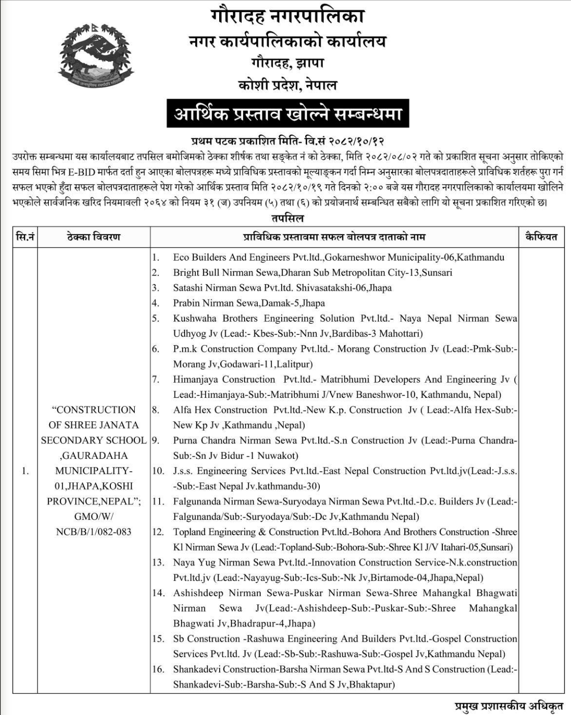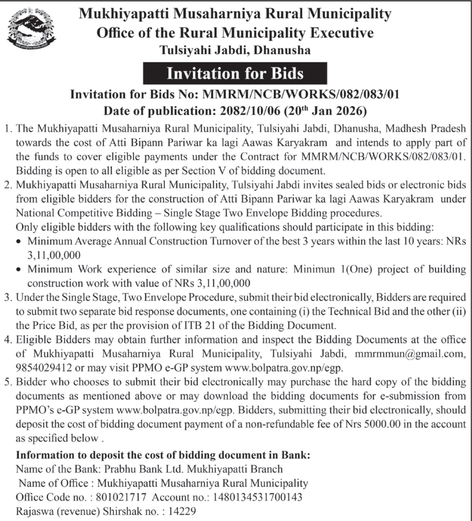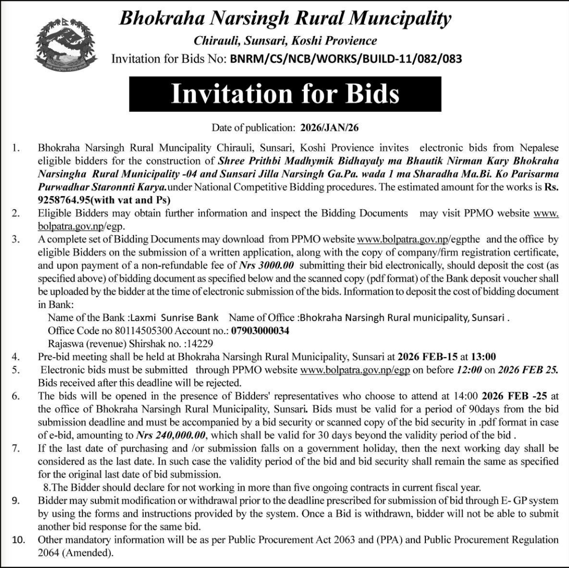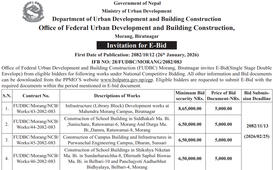 | 51 | Katari Municipality Office, Koshi Province, UDAYAPUR; | Construction of Janamukhi Ma.Vi School Building, Baseri, Katari 12 | 25/01/2026 | PPMO | 25/02/2026 | Click Here | |