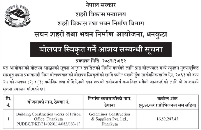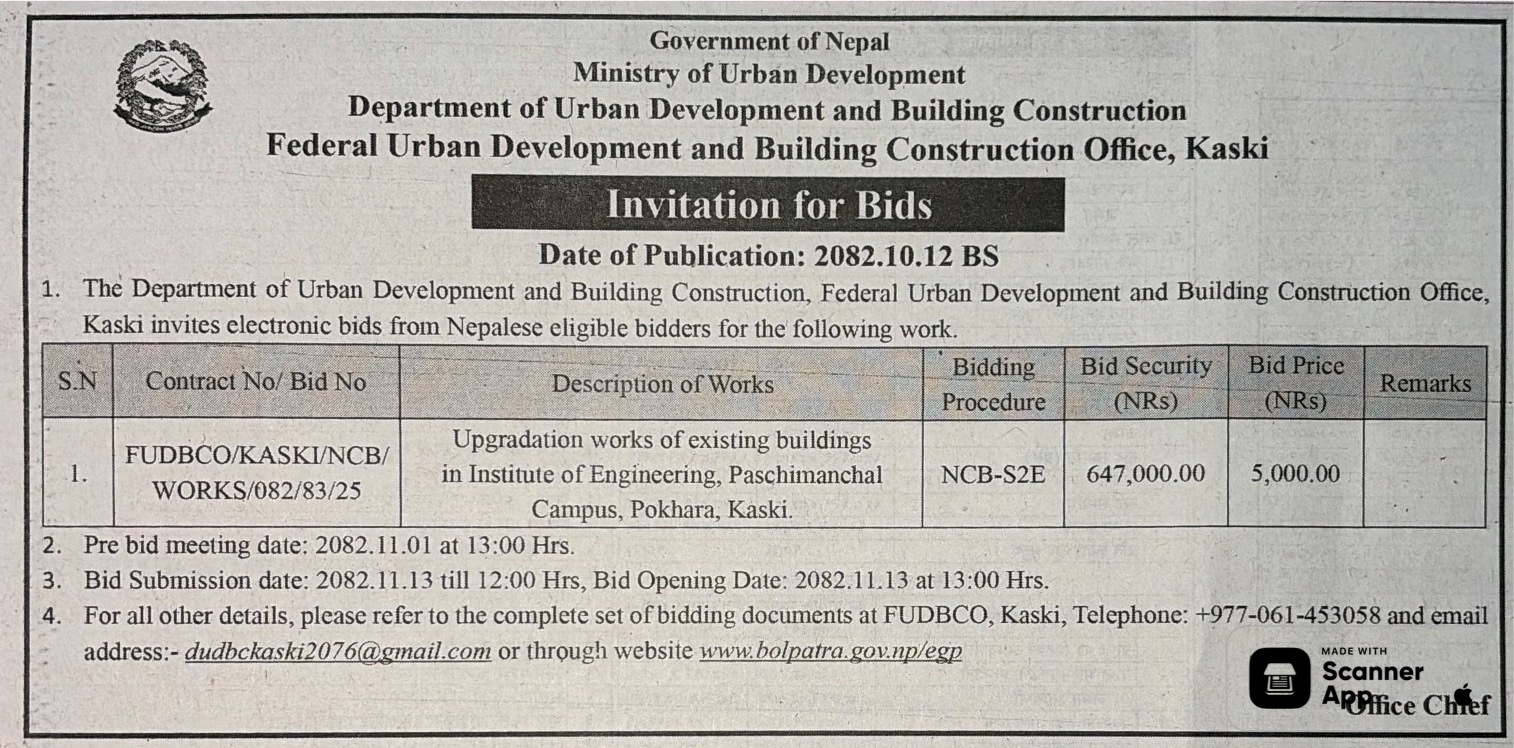 | 166 | Urban Development & Building Office Ghorahi, Dang | Bhalaisoti Samudayik Ban Bhawan Nimuriya Urban Infrastructure Construction Works, Ghorahi-3, Dang. | 25/01/2026 | PPMO | 09/02/2026 | Click Here | |