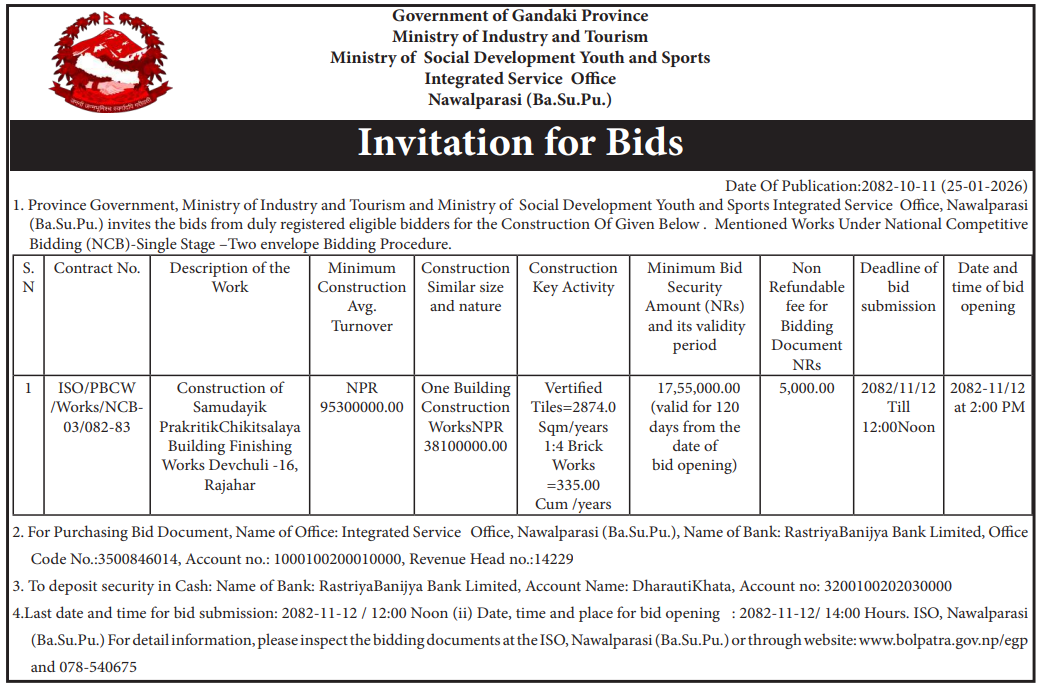 | 97 | Integrated Service Office, Kawasoti, Nawalparasi | Construction of Samudayik Prakritik Chikitsalaya Building Finishing Works Devchuli -16 , Rajahar | 25/01/2026 | PPMO | 24/02/2026 | Click Here | |