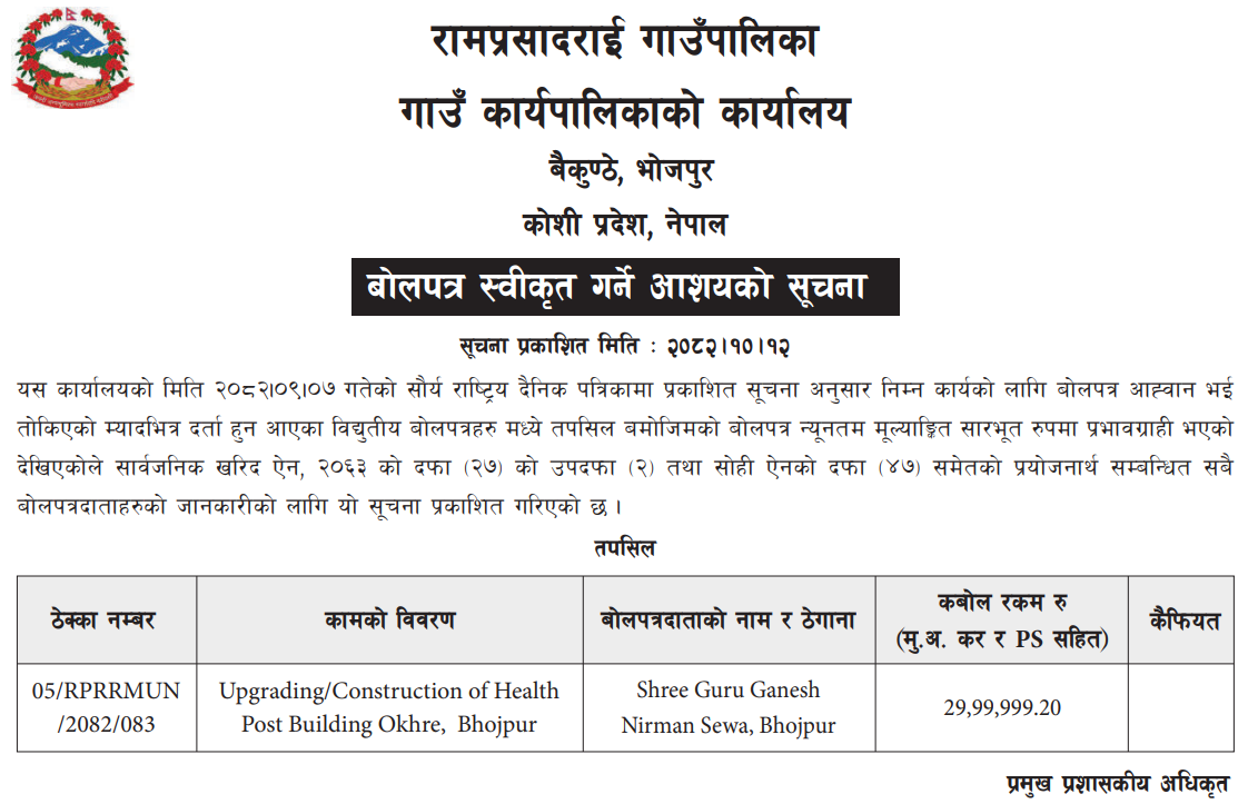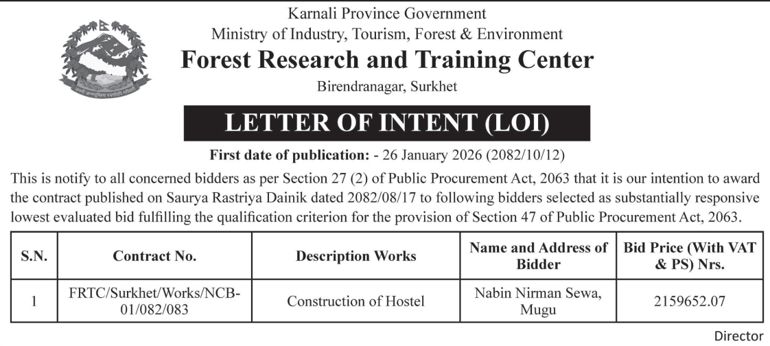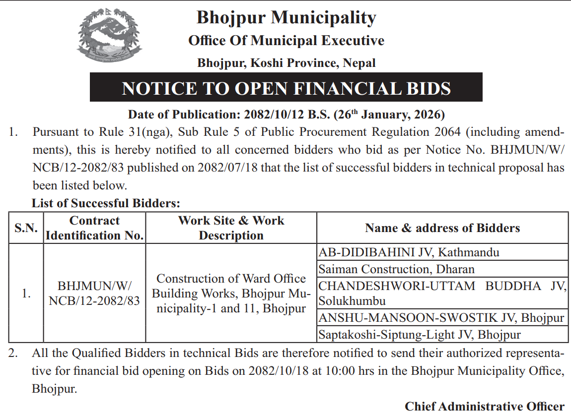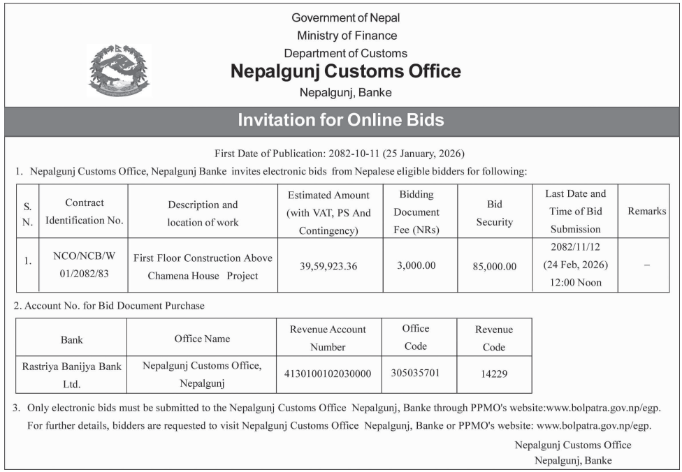 | 140 | Patrasi Rural Municipality Office, Karnali Province, JUMLA; | Construction of Office Building | 25/01/2026 | PPMO | 23/02/2026 | Click Here | |
