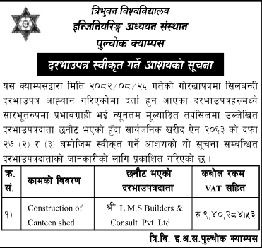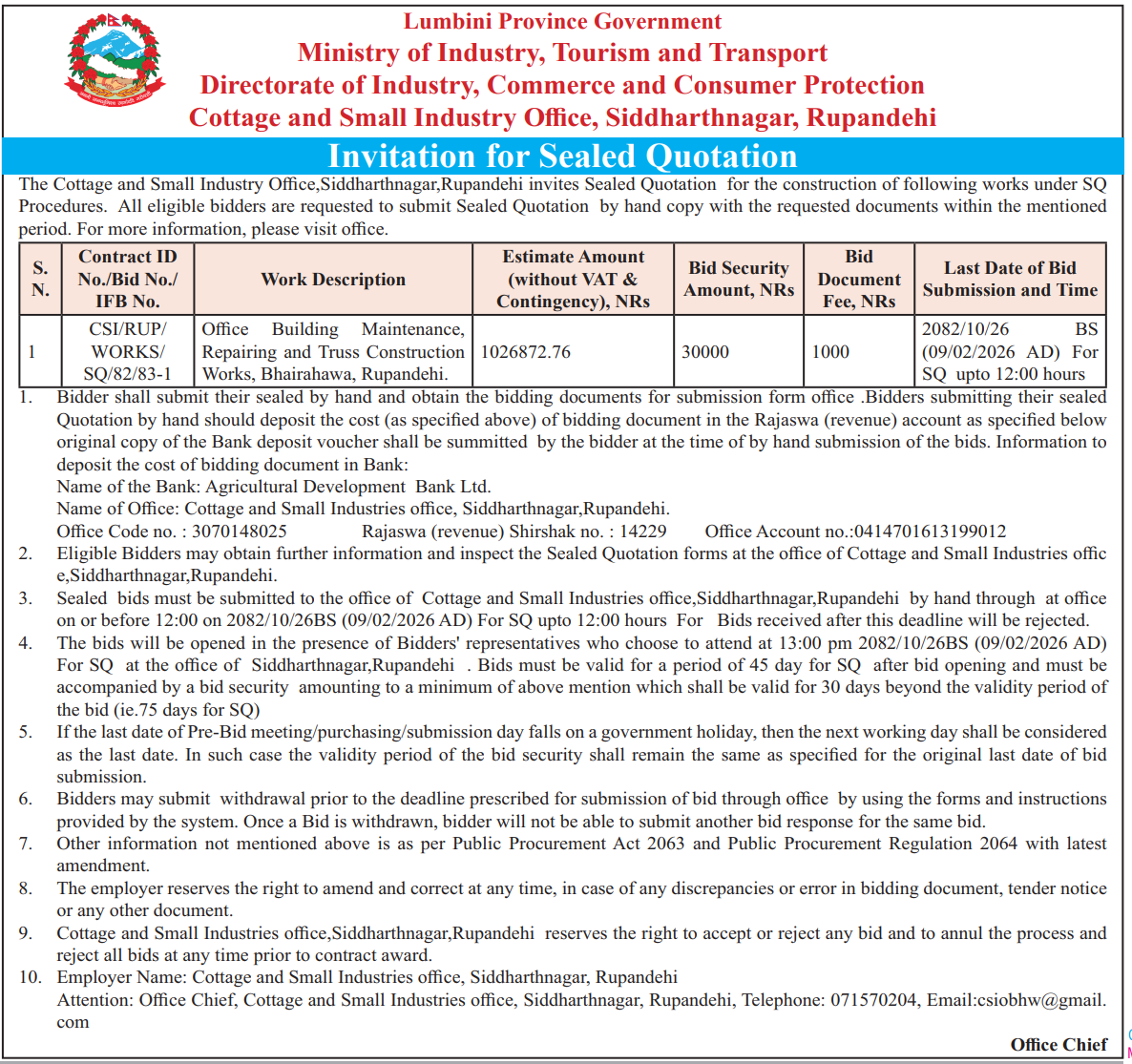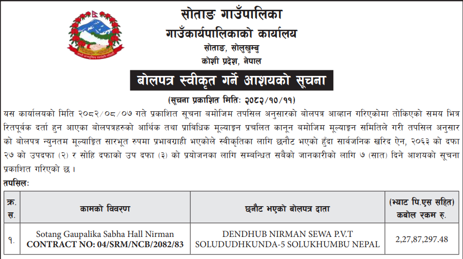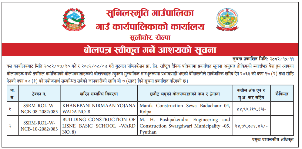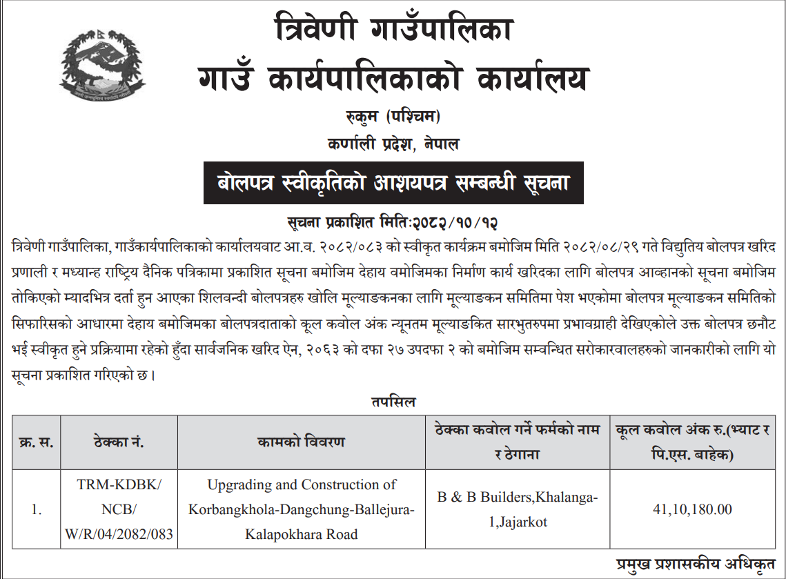 | 140 | Patrasi Rural Municipality Office, Karnali Province, JUMLA; | Construction of Office Building | 25/01/2026 | PPMO | 23/02/2026 | Click Here | |