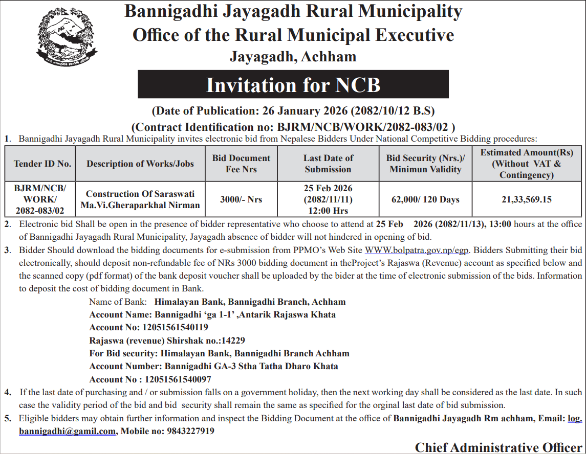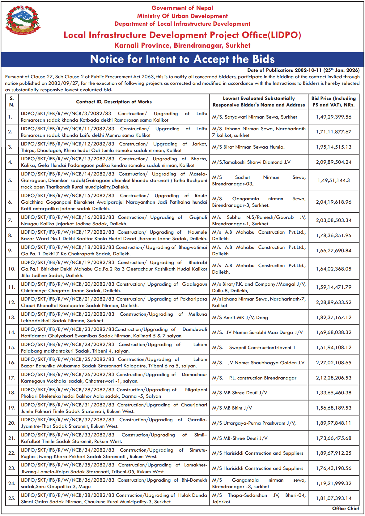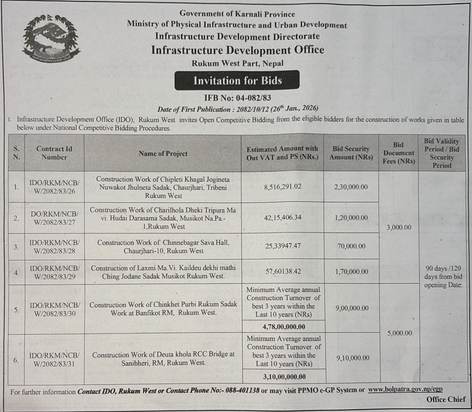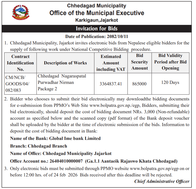 | 75 | Chhedagad Municipality Office, Karnali Province, JAJARKOT; | Chhedagad Nagaraspatal Purwadhar Nirman Pacakage-2 | 25/01/2026 | PPMO | 24/02/2026 | Click Here | |