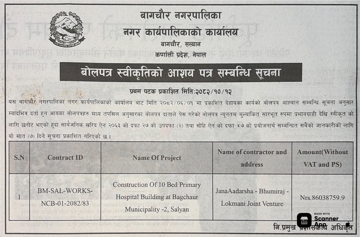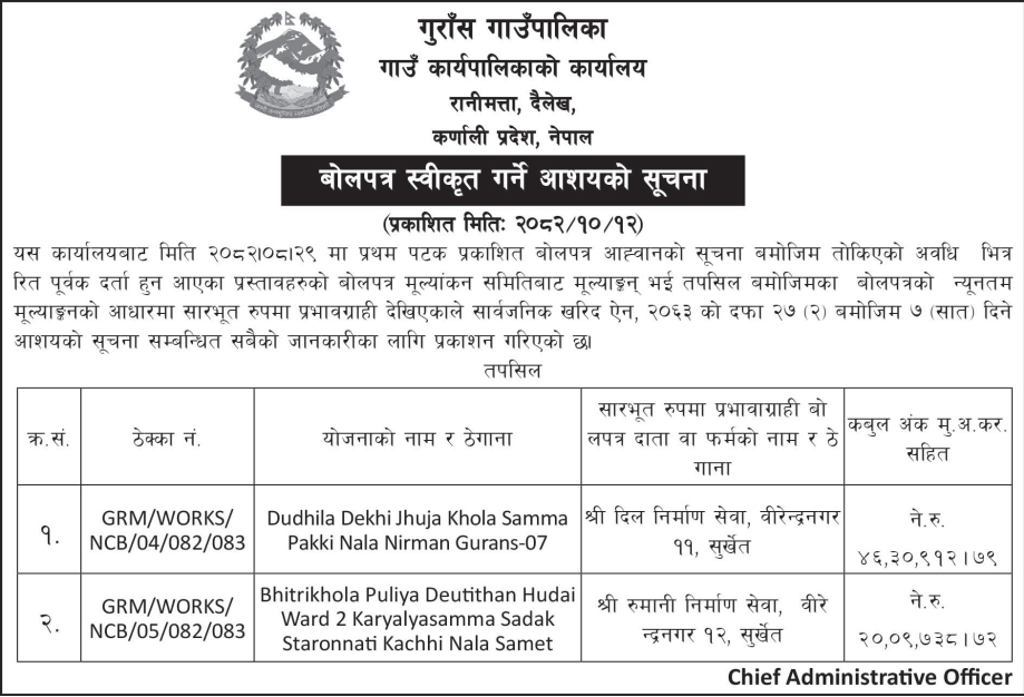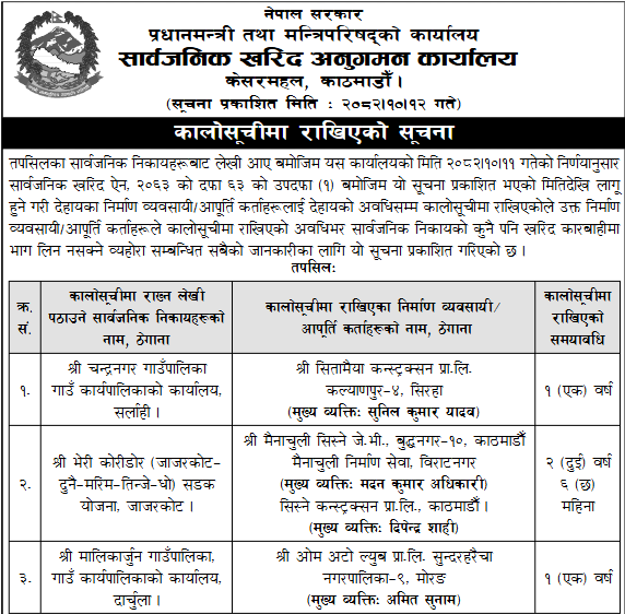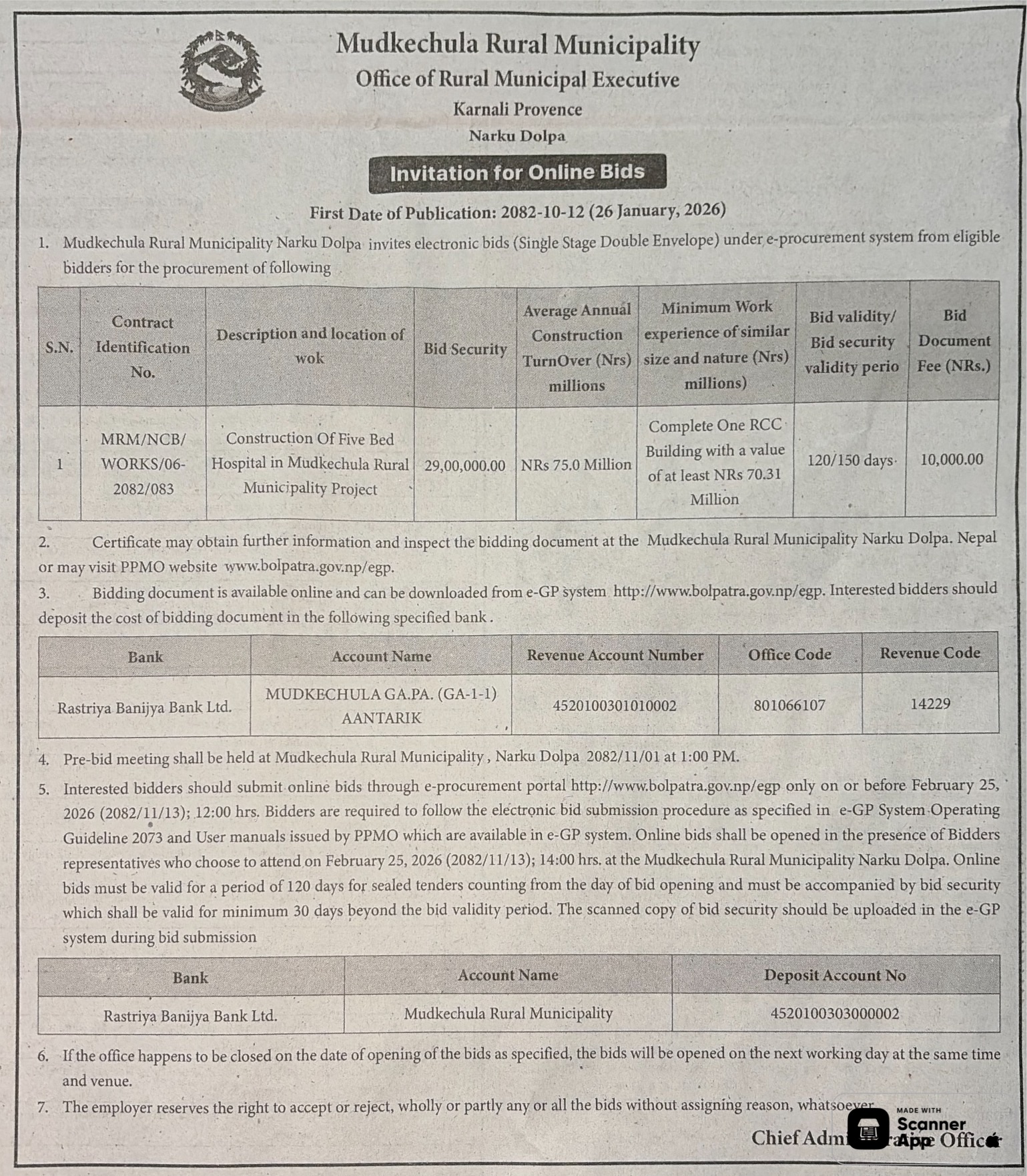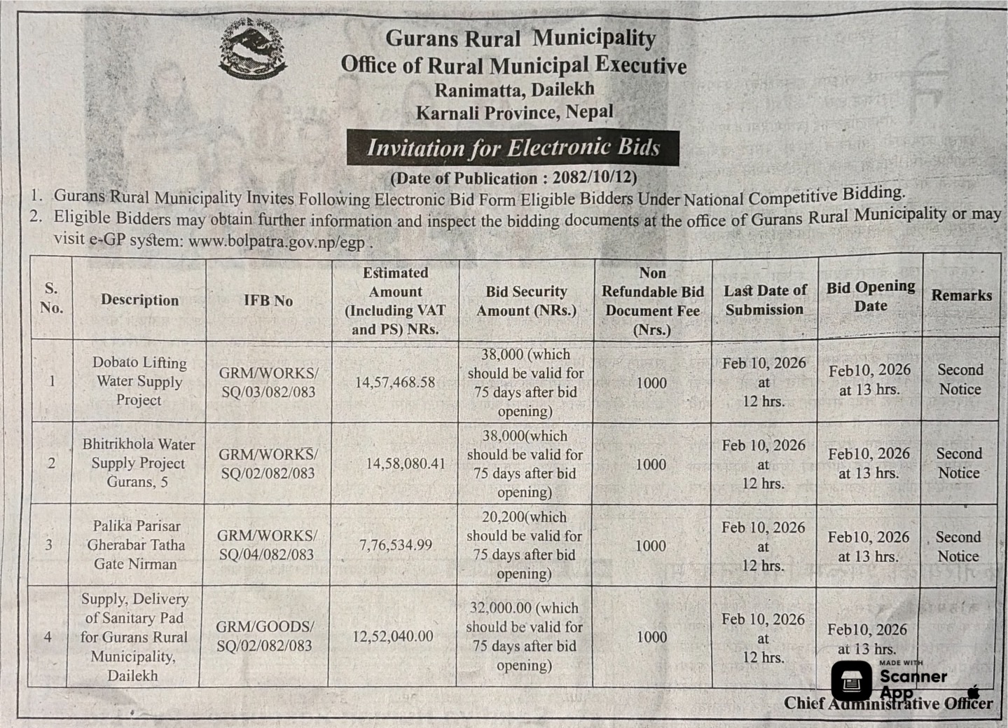 | 75 | Chhedagad Municipality Office, Karnali Province, JAJARKOT; | Chhedagad Nagaraspatal Purwadhar Nirman Pacakage-2 | 25/01/2026 | PPMO | 24/02/2026 | Click Here | |