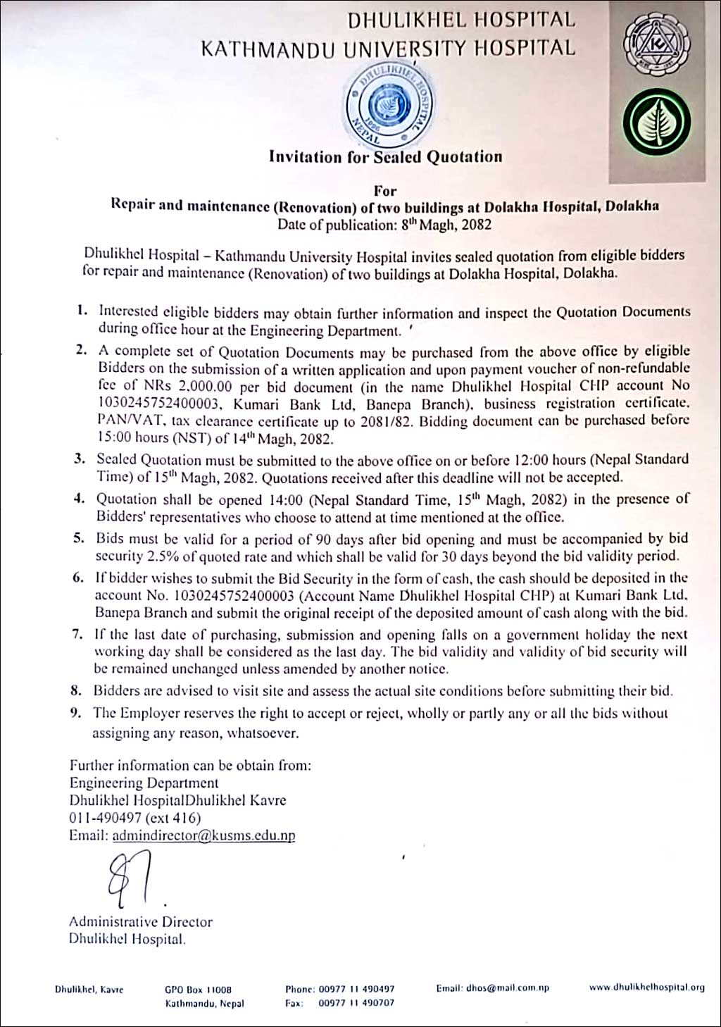 | 15 | Dakshinkali Municipality,Pharping Kathmandu | Procurement of Video X-ray machine and Dr-X-ray machine. | 25/01/2026 | PPMO | 24/02/2026 | Click Here | |