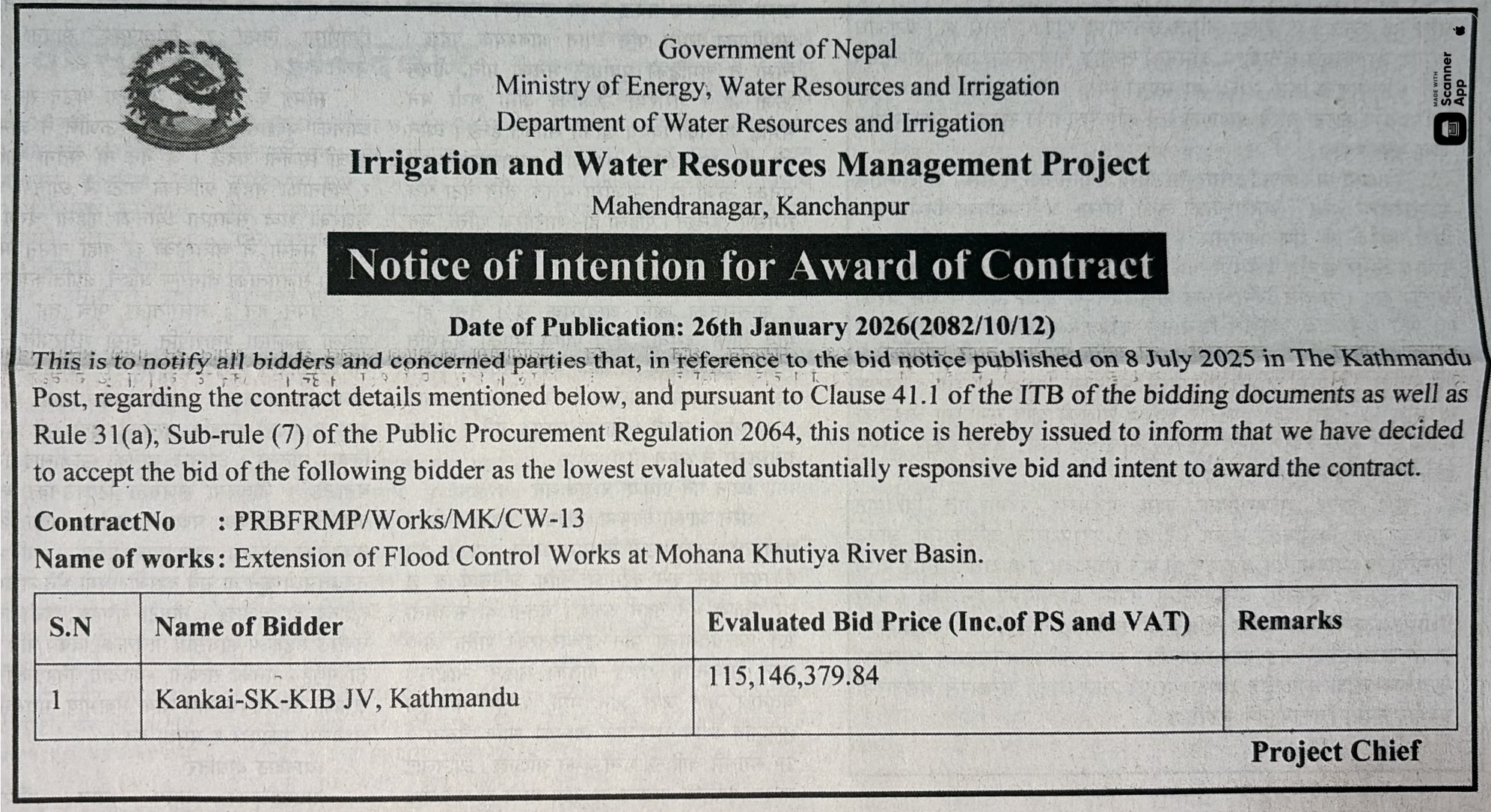 | 99 | Irrigation and Water Resources Management Project, Mahendranagar, Kanchanpur | Mohana River Training Works | 25/01/2026 | PPMO | 24/02/2026 | Click Here | |
