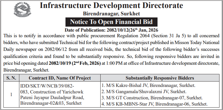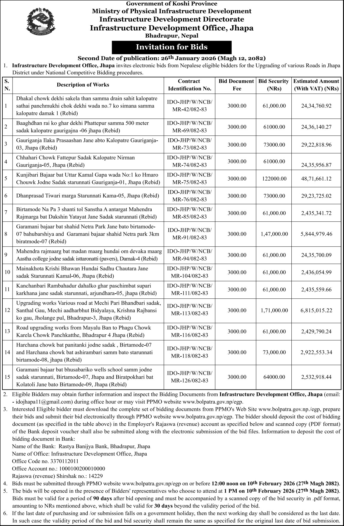 | 38 | Infrastructure Development Office (IDO), Siraha | Siraha Devipur dekhi Bishnupur Siraha samm ko Sadak | 25/01/2026 | PPMO | 25/02/2026 | Click Here | |