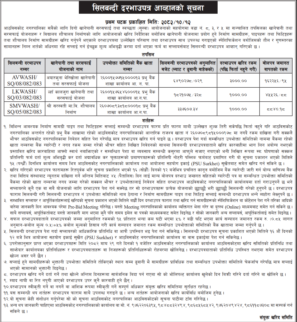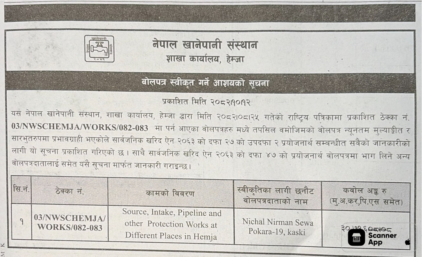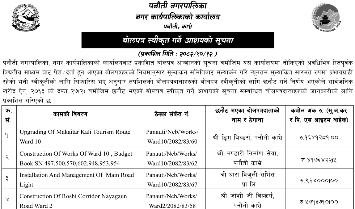 | 113 | Phalebas Municipality Office, Gandaki Province, PARBAT; | Nuwar Kaure Basti Samrakshan | 25/01/2026 | PPMO | 24/02/2026 | Click Here | |